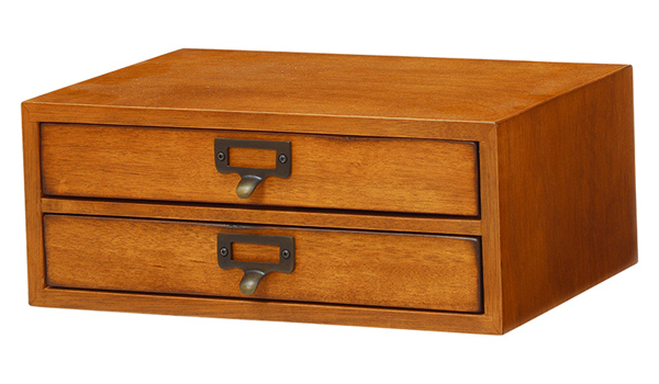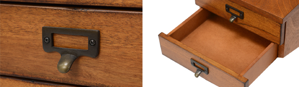 | 引き出しの取っ手 指を引っ掛けて引き出せます。 古風な印象。 | 引き出しの中身 コンパクトだけどしっかり収納できます。書類収納や小物収納に。 |