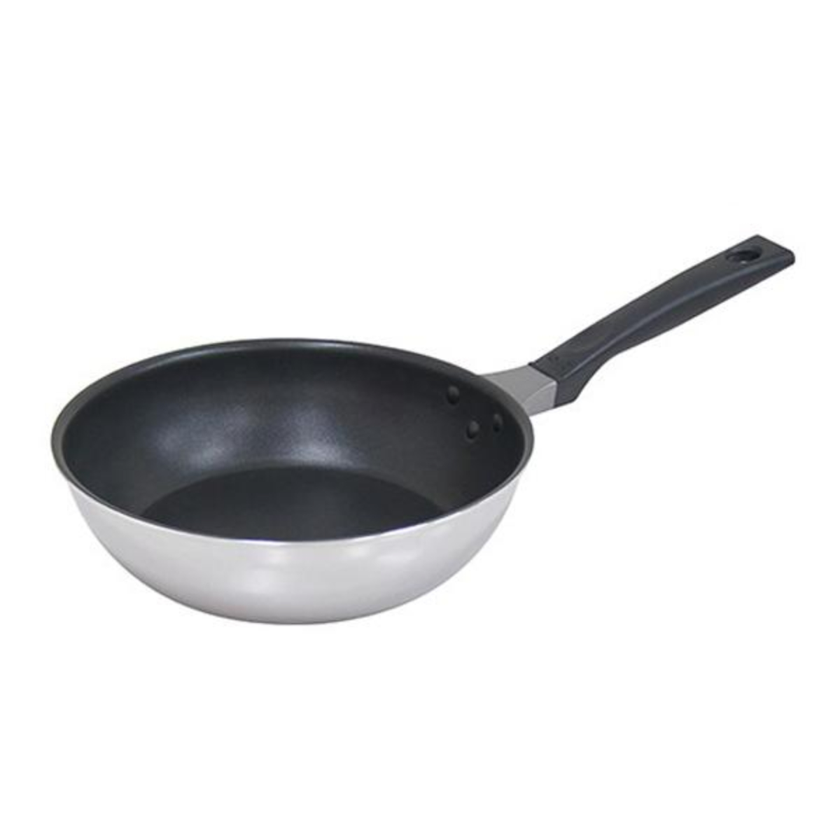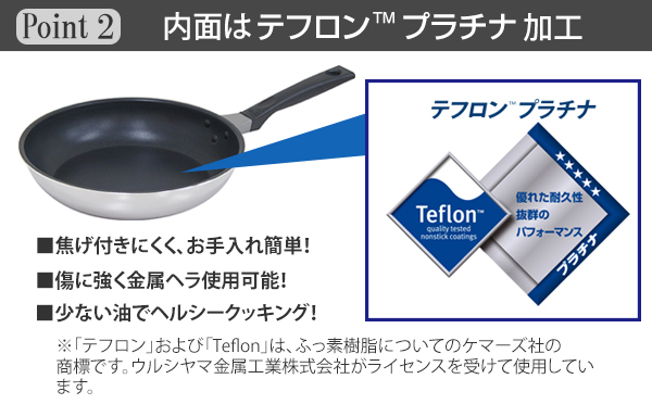 フライパンの内面は、ケマーズ社のテフロンプラチナ加工が施しており、お料理がこびりつきにくく お手入れが簡単です。金属ヘラの使用もOKです。