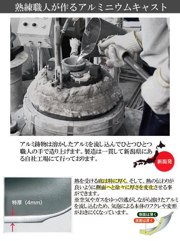 ●アルミ鋳物は溶かしたアルミを流し込んでひとつひとつ造り上げているので、熱を受ける底は特に厚く、そして、熱の伝わりが良いように側面へと徐々に厚さを変化させることができます。
