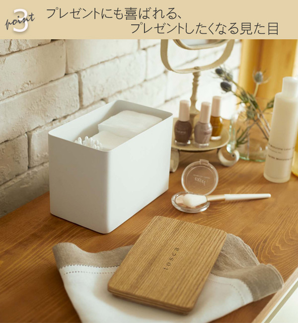 大容量のコットンと、綿棒なども一緒に収納できます。散らかりがちなお手入れ道具もまとめて置けるので、毎日のメイクや身支度もスムーズにできますよ♪