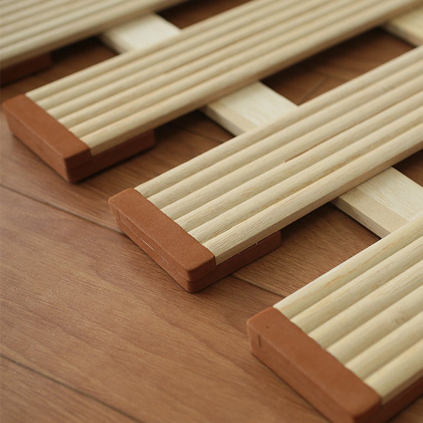 | 安心・安全設計 釘やタッカーなどを一切使用していない安全設計です。床を傷つけない樹脂性クッションがついており、長くお使いいただけるように配慮しています。 | イタッ!を改善 夜中に起きて立ち上がると・・・「イタッ!」を改善しました。優しい樹脂性クッションがすのこの板側面をカバーしています。 |