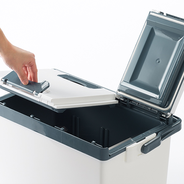 | 便利な仕切り 区切りに便利な仕切り付きで、移動中も収納物の転倒を防ぐことができます。 | 両開きフタ フタは取り外し可能で、左右のどちらからでも開けられます。向きを気にする必要がないので、便利です。 |