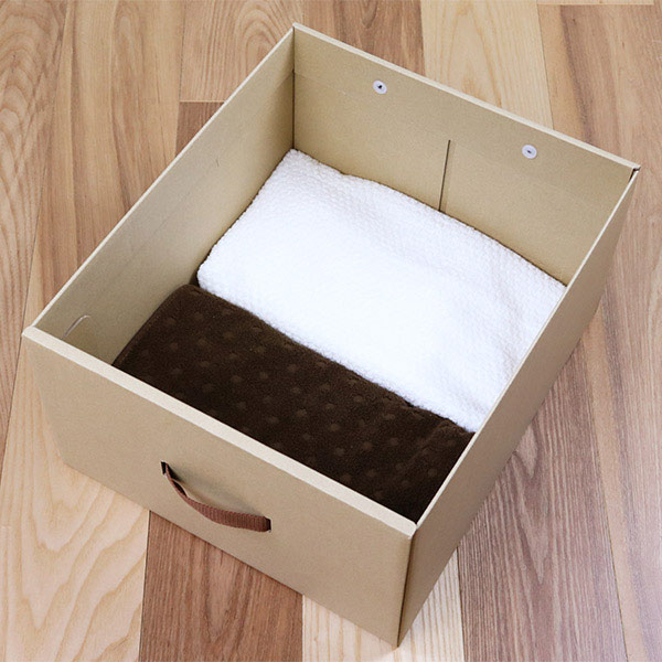 厚手の衣類、毛布、タオルケットの収納に便利な深型の収納ボックスです。ダンボール製なので軽くて持ち運びやすく組み立ても簡単です。1人暮らし、短期のイベント、出張や転勤が多い方の、一時的な衣類収納として最適です。