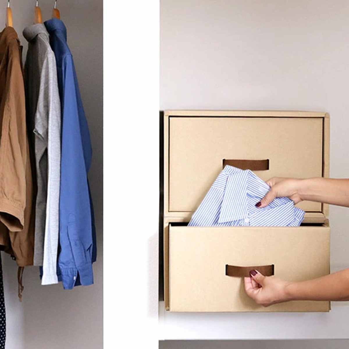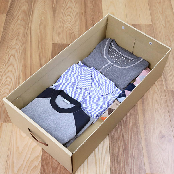 衣類、毛布、タオルケットの収納に便利な収納ボックスです。ダンボール製なので軽くて持ち運びやすく組み立ても簡単です。1人暮らし、短期のイベント、出張や転勤が多い方の、一時的な衣類収納として最適です。