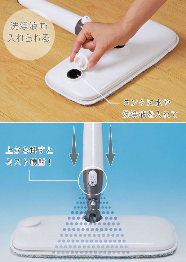 ぐっと押し込むと、タンクにセットした水が噴射されます。洗浄液も入れることができ、頑固な汚れへの本格お掃除も可能です。ミスト状に噴射するので周りが水浸しになる心配もありません。