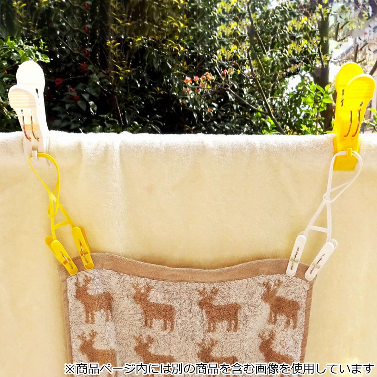 ●ひも付きのピンチを一緒に使えば、洗濯物を地面等に触れさせないようにすることができます。