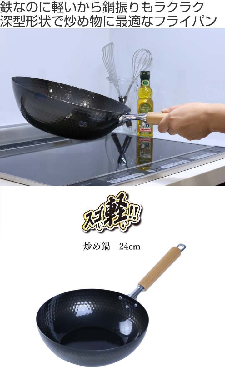 鉄フライパン 24cm IH対応 スゴ軽 槌目鉄炒め鍋 日本製 ( ガス火対応 鉄フライパン 深型フライパン 24センチ 鉄製フライパン 炒め鍋 いため鍋 軽量 槌目鍋 ディープパン 空焚き不要 オール熱源対応 )