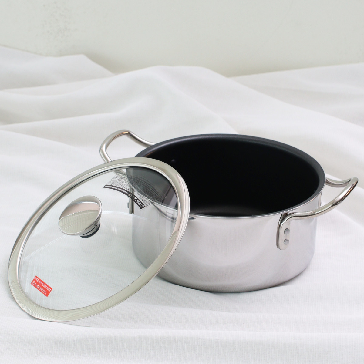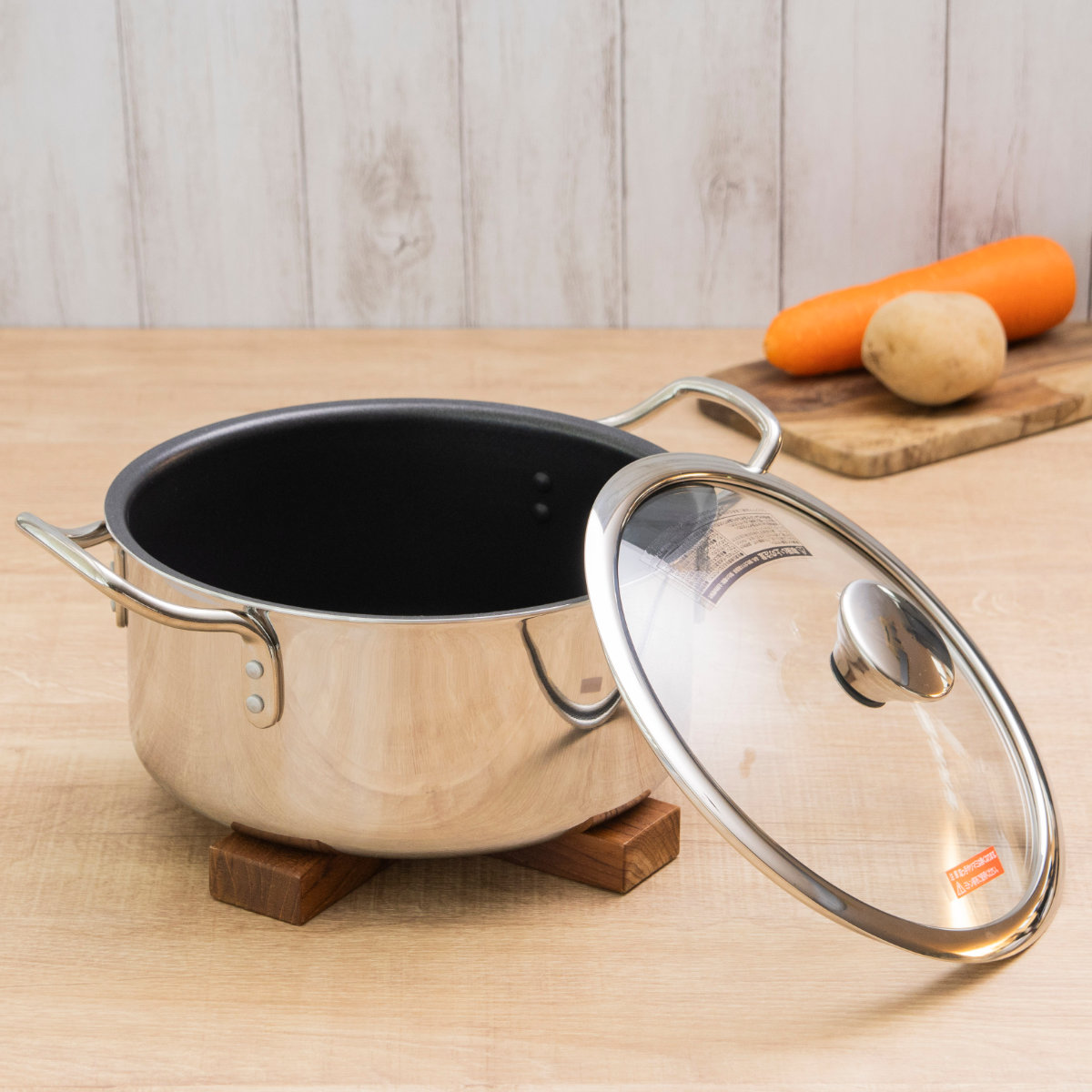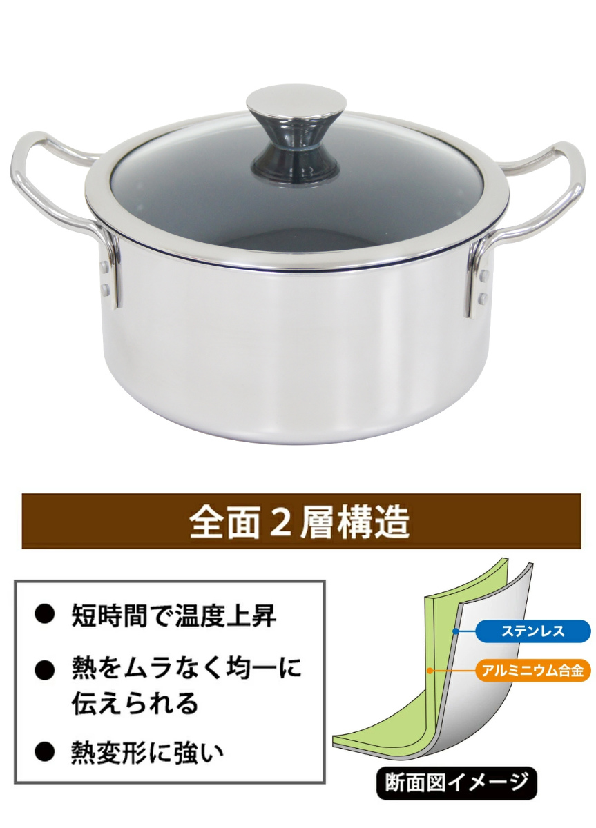 | 材質 | 本体:2層クラッド材(板厚1.7mm) (内側:アルミニウム合金、外側:ステンレス鋼) 本体内面:ふっ素樹脂塗膜加工 本体外面:ミラー研磨仕上げ ハンドル:ステンレス鋼 蓋:強化ガラス器具 蓋リング:ステンレス鋼 蓋ツマミ:ステンレス鋼 |