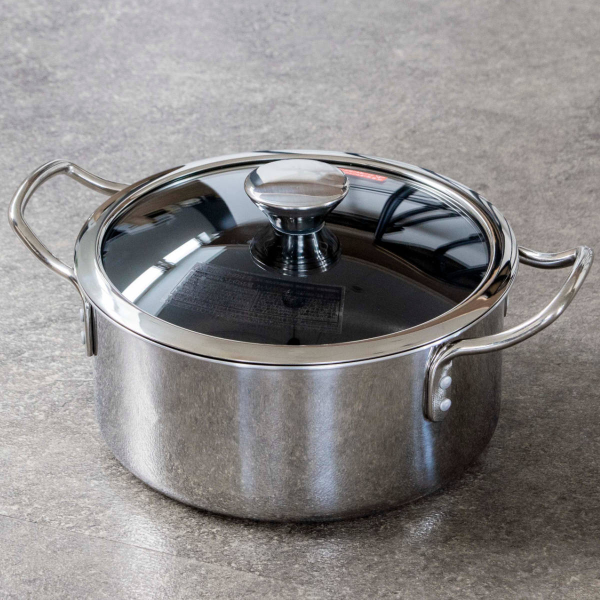 外側ステンレスと内側アルミニウムの2層構造で、ステンレスの保温性とアルミの熱伝導性のいいとこどりの鍋です。2つの金属を組み合わせるので少し重さがありますが、熱を均一に伝えられるので、お料理がおいしく仕上がります。