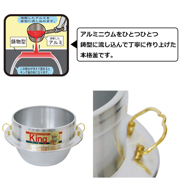 熟練鋳物職人がアルミニウムをひとつひとつ鋳型に流し込んで丁寧に造り上げた本格釜です。