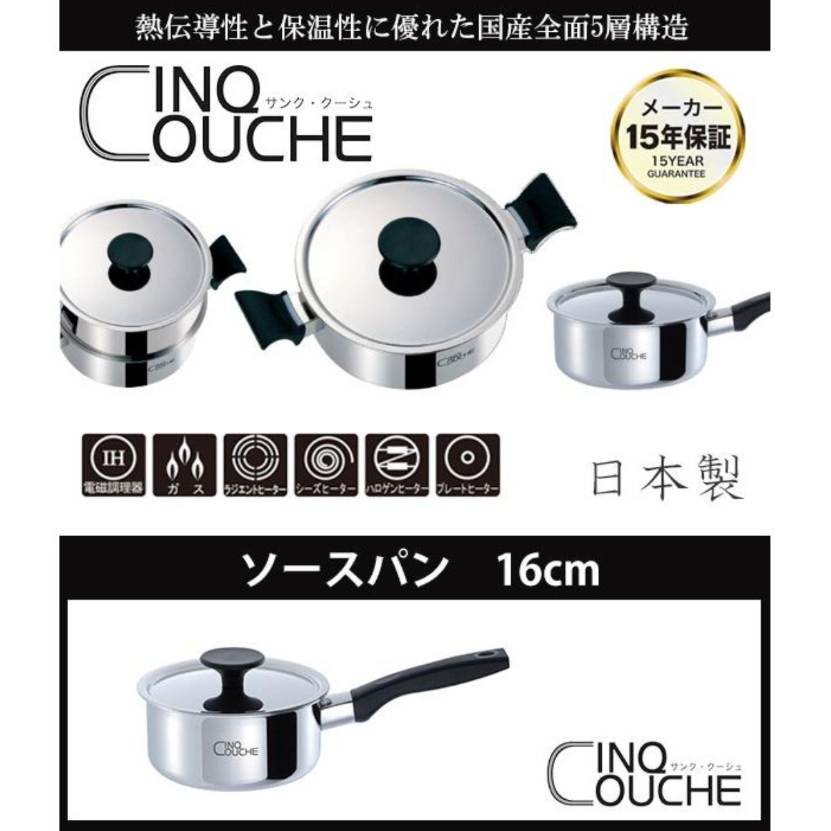 国内の自社工場で造られた全面5層構造材を使用したサンク・クーシュシリーズのソースパンです。熱伝導性に優れ、強度を高めたアルミニウム3層を、保温性に優れたステンレスで挟み込みました。
