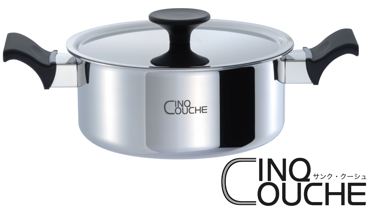 国内の自社工場で造られた全面5層構造材を使用したサンク・クーシュシリーズのシチューポットです。熱伝導性に優れ、強度を高めたアルミニウム3層を、保温性に優れたステンレスで挟み込みました。