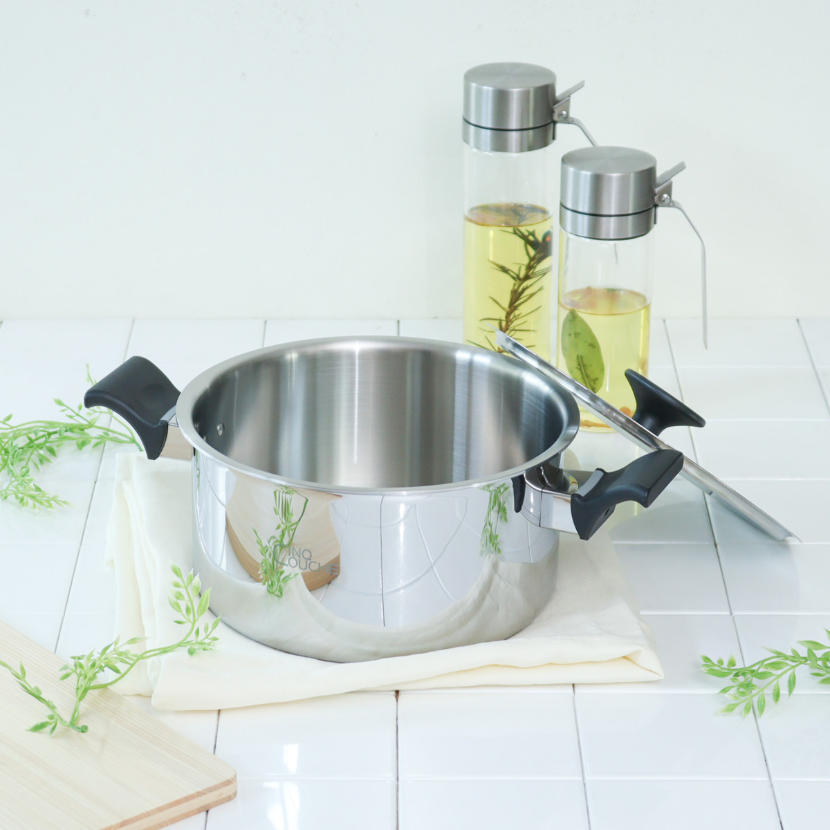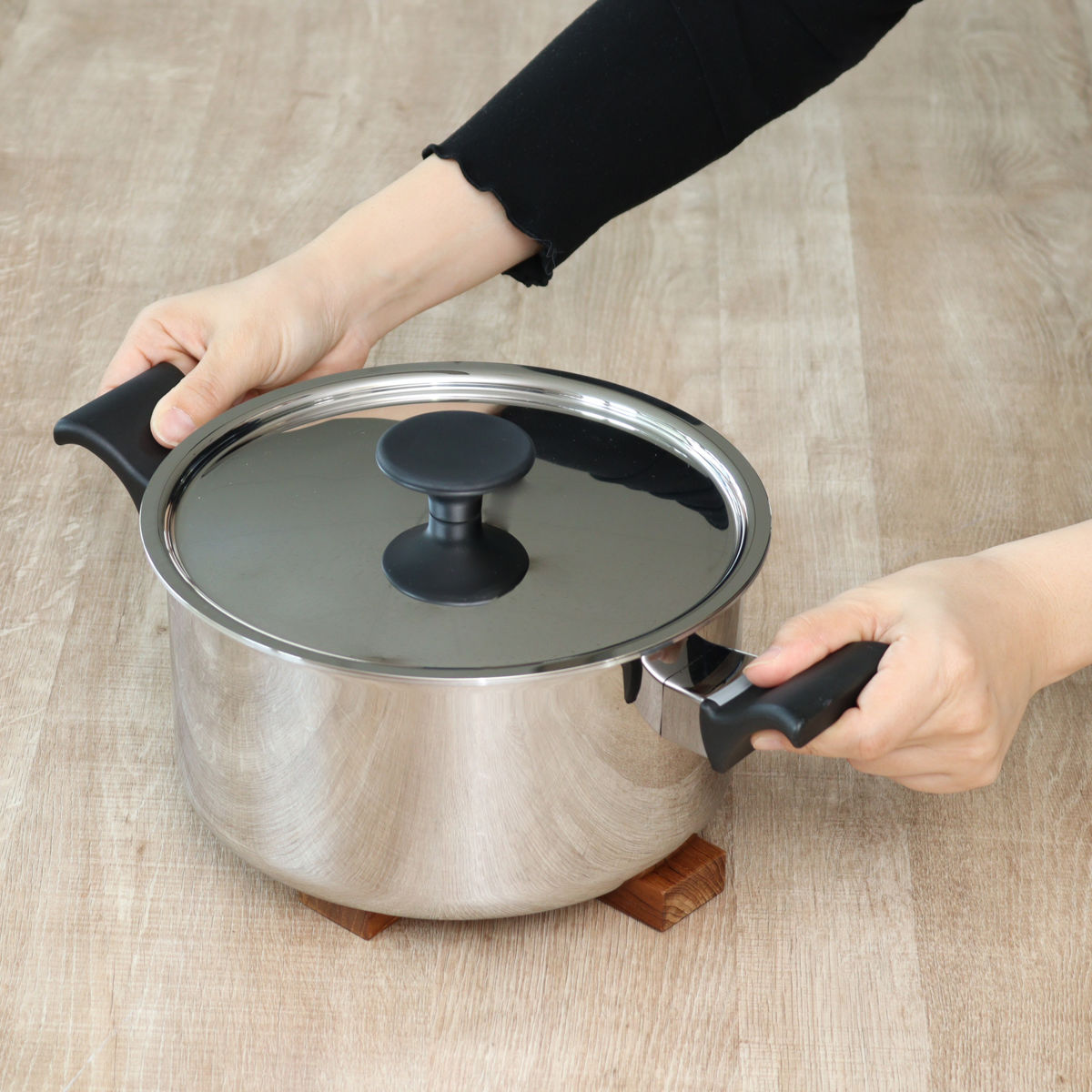 | 材質 | 本体:5層クラッド材(外側:ステンレス、内側:アルミニウム) 本体内面:ラセン研磨仕上げ 本体外面:ミラー研磨仕上げ 蓋:ステンレス鋼 ハンドル:フェノール樹脂・66ナイロン 蓋ツマミ:フェノール樹脂 |