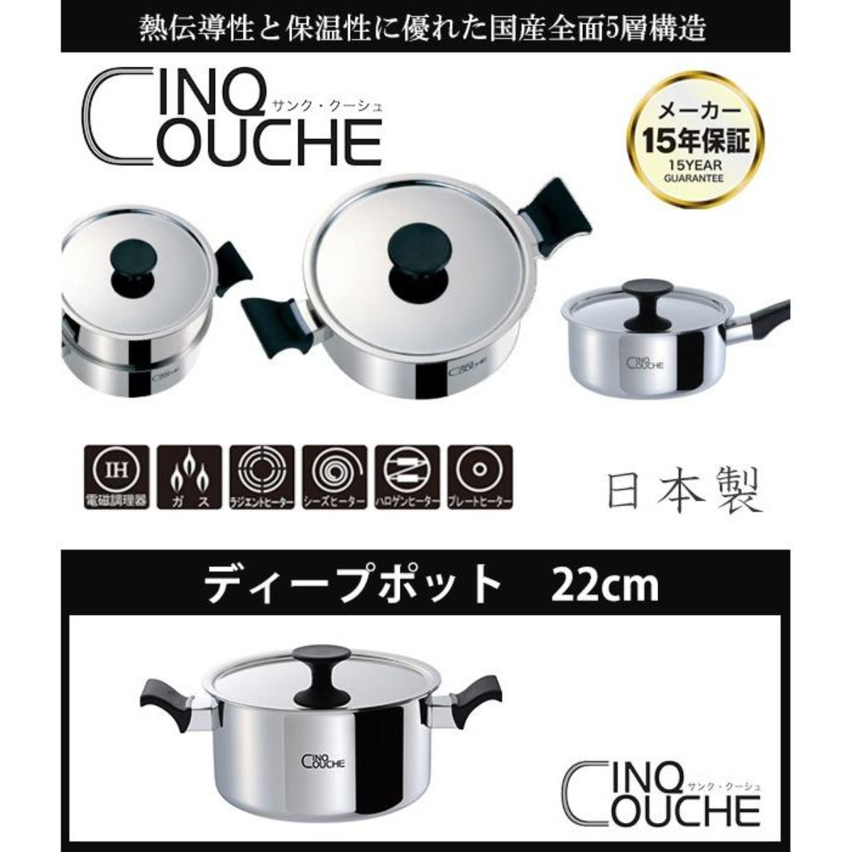 国内の自社工場で造られた全面5層構造材を使用したサンク・クーシュシリーズのディープポットです。熱伝導性に優れ、強度を高めたアルミニウム3層を、保温性に優れたステンレスで挟み込みました。