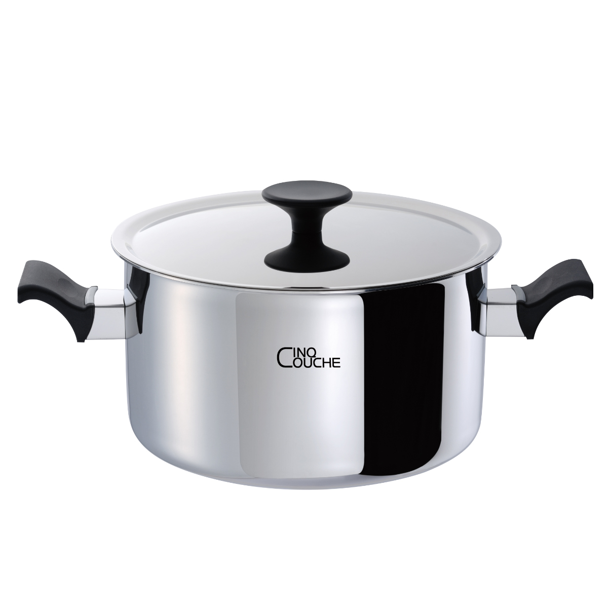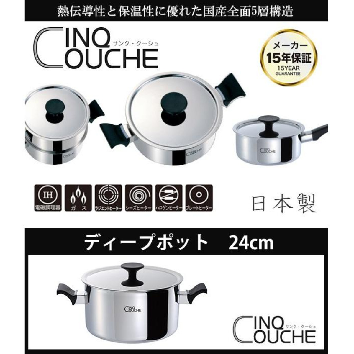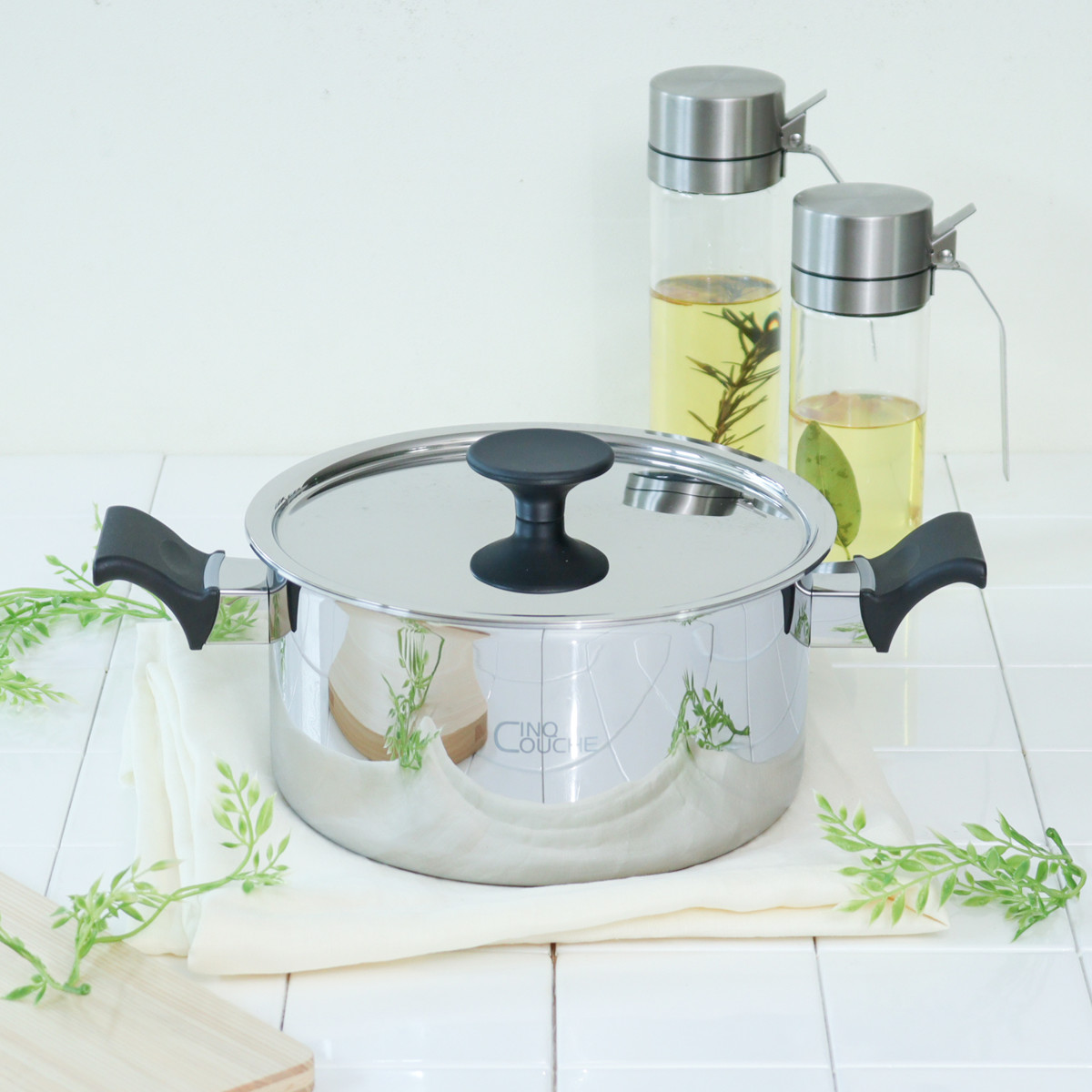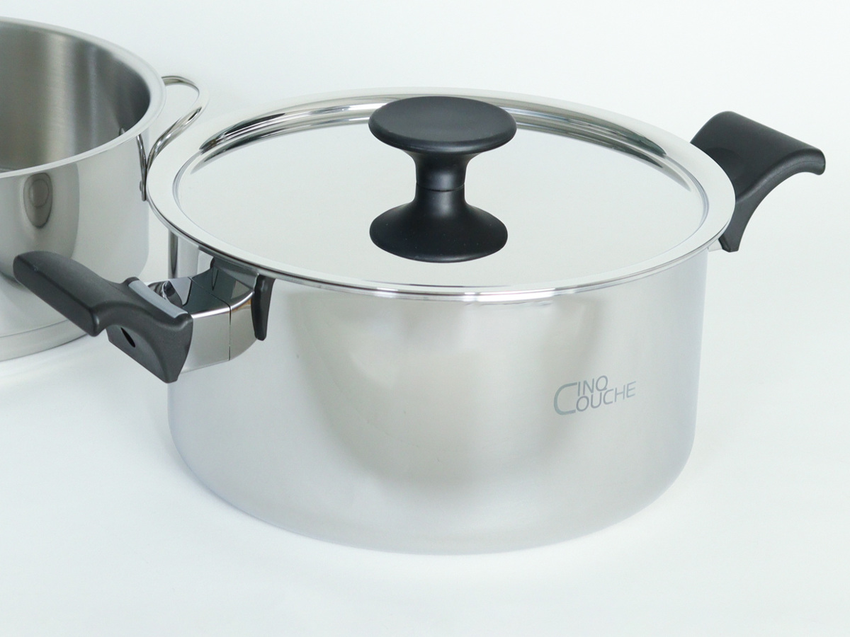 国内の自社工場で造られた全面5層構造材を使用したサンク・クーシュシリーズのディープポットです。熱伝導性に優れ、強度を高めたアルミニウム3層を、保温性に優れたステンレスで挟み込みました。