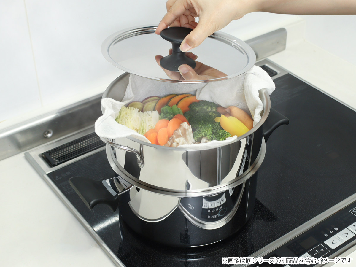 サンク・クーシュシリーズは18cm・20cm・22cm・24cmのスチーマー(別売り)をご用意しております。同サイズの鍋と合わせてお使いください。