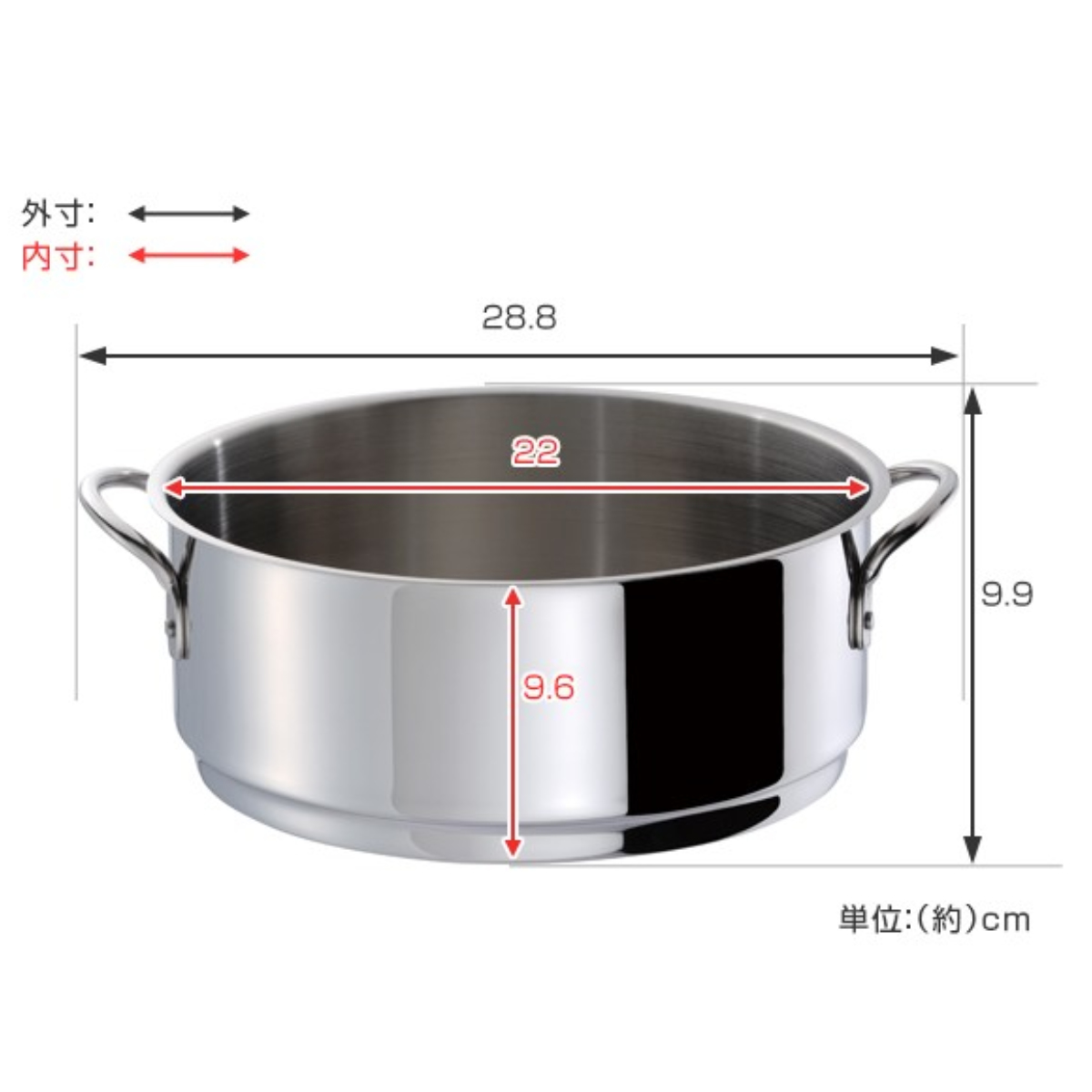 | 材質 | 本体:ステンレス鋼 本体内面:ラセン研磨仕上げ 本体外面:ミラー研磨仕上げ ハンドル:ステンレス鋼 |