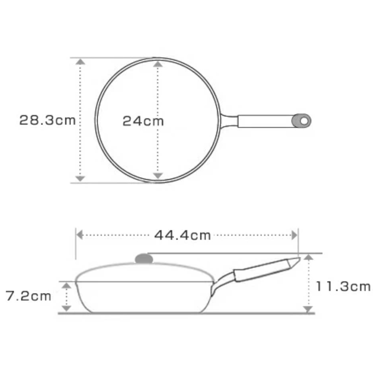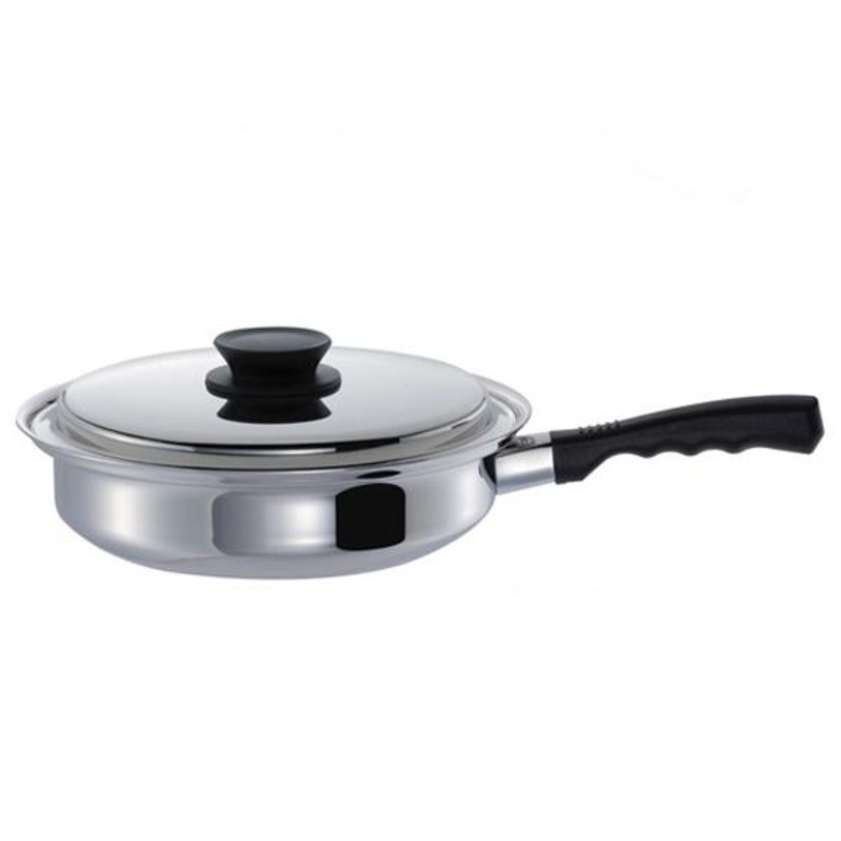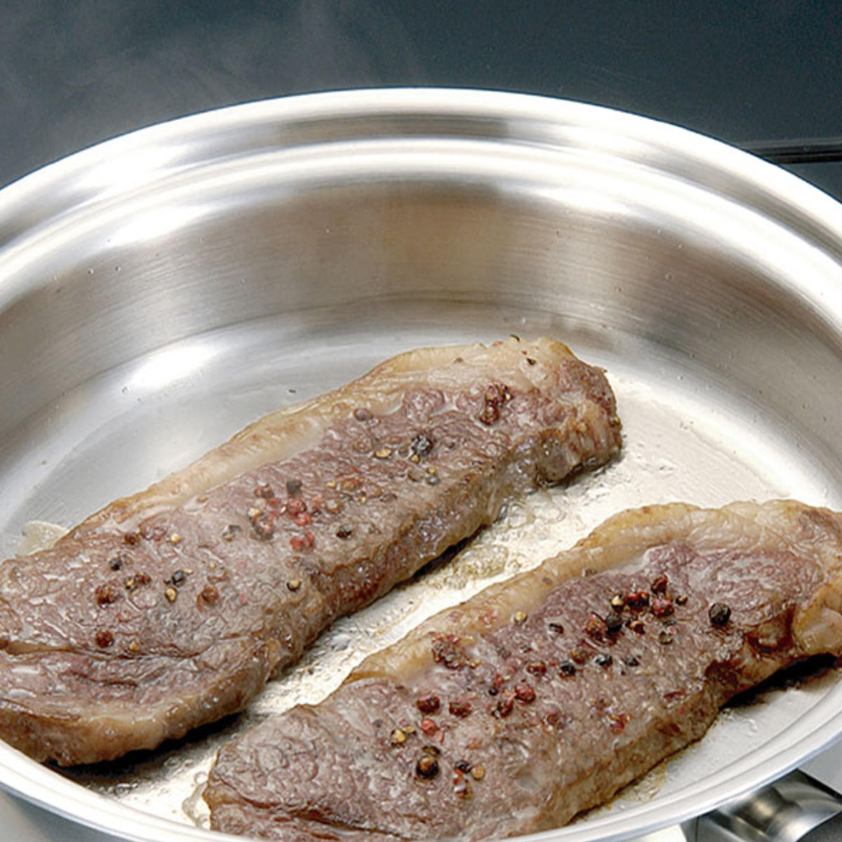 | 材質 | 本体:3層クラッド材(内側:ステンレス鋼、中心:アルミニウム合金、外側:ステンレス鋼) 本体内面:ラセン研磨仕上げ 本体外面:ミラー研磨仕上げ 蓋:ステンレス鋼 ハンドル:フェノール樹脂 蓋ツマミ:フェノール樹脂 |