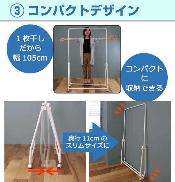お部屋で気軽に干して欲しいから、省スペースに置けるコンパクトデザインになっています。