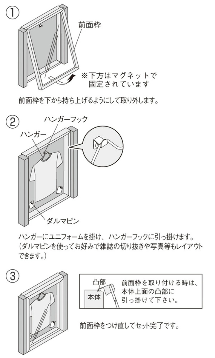 壁に掛けたまま出し入れできる!前面開閉式のユニフォーム額