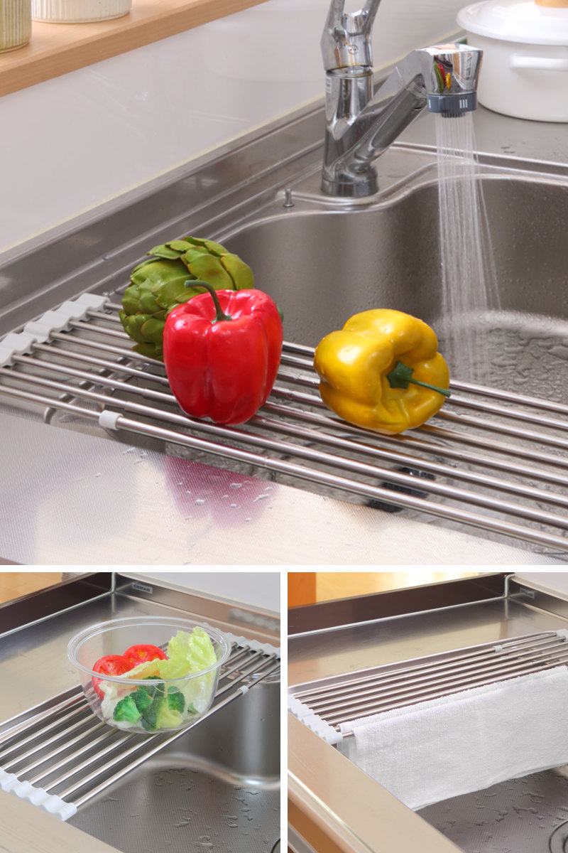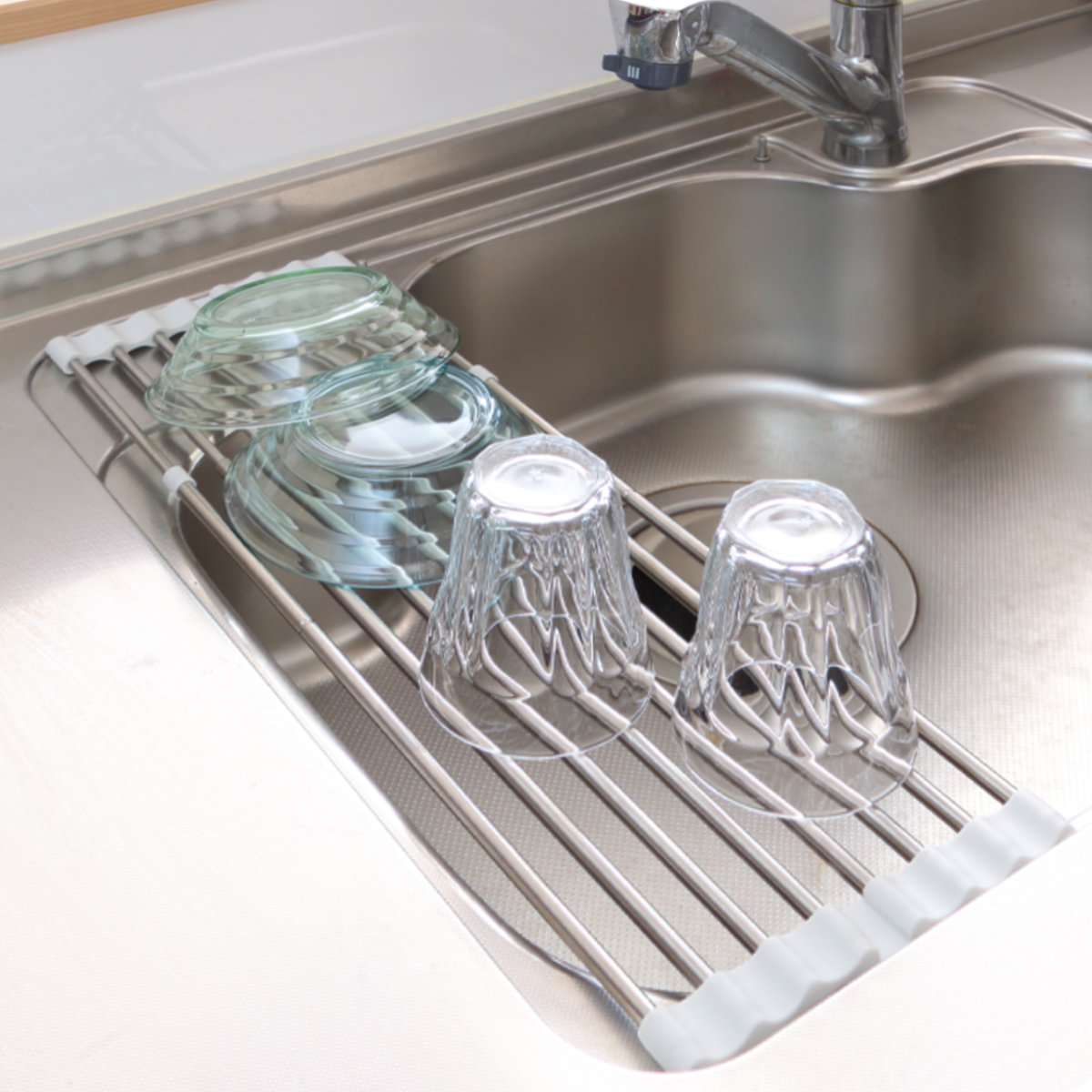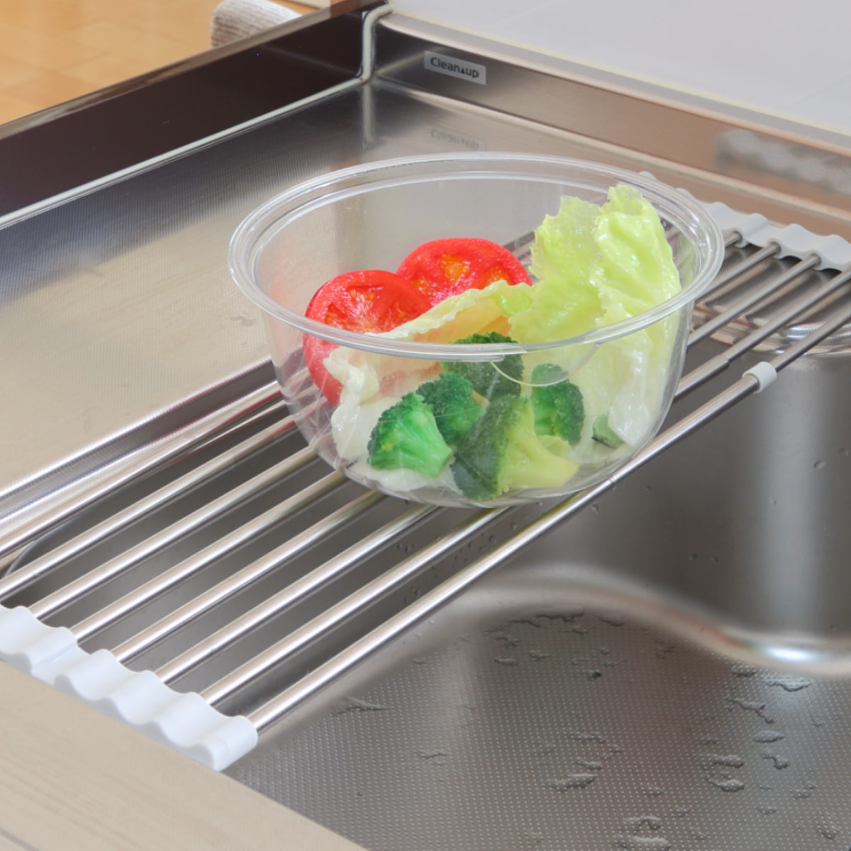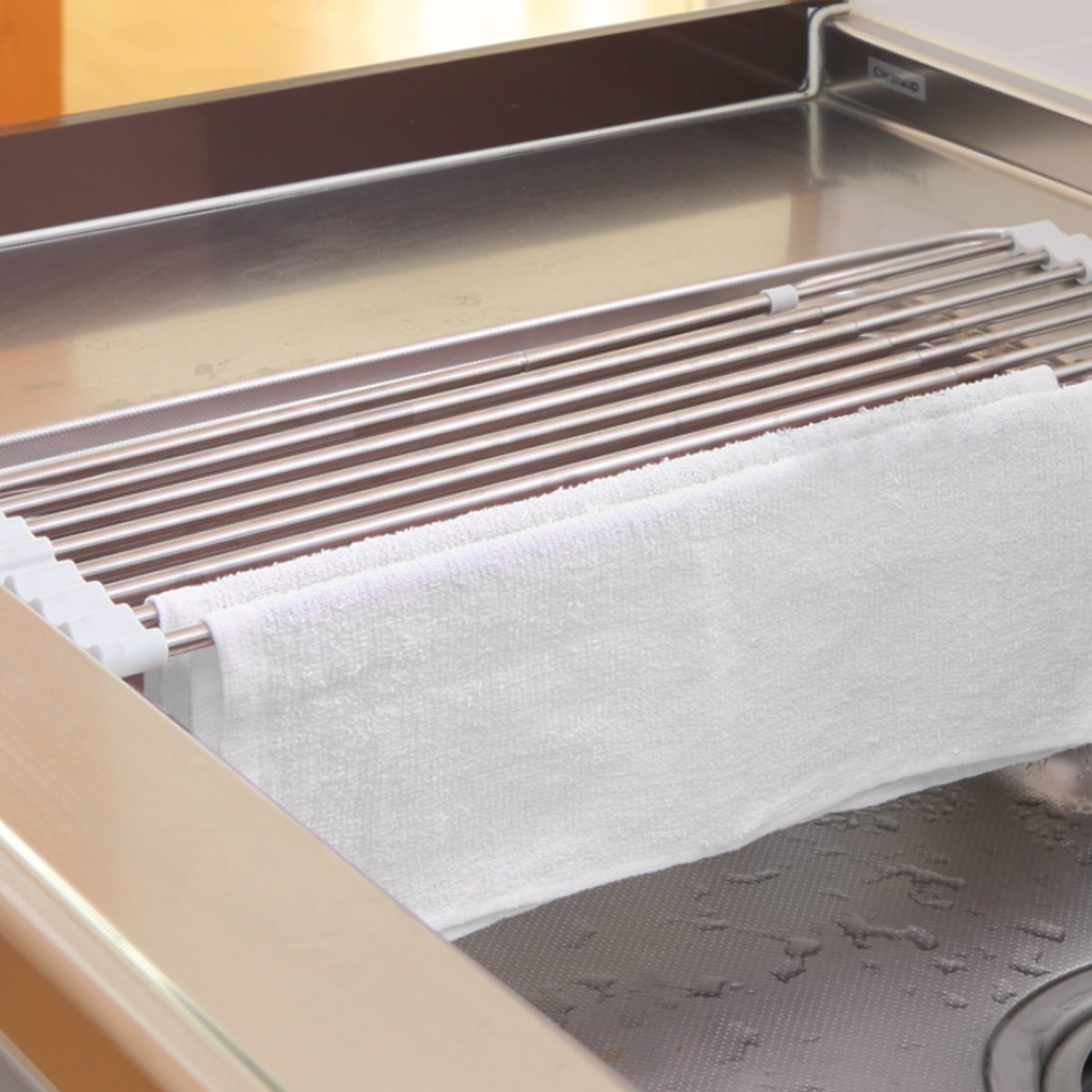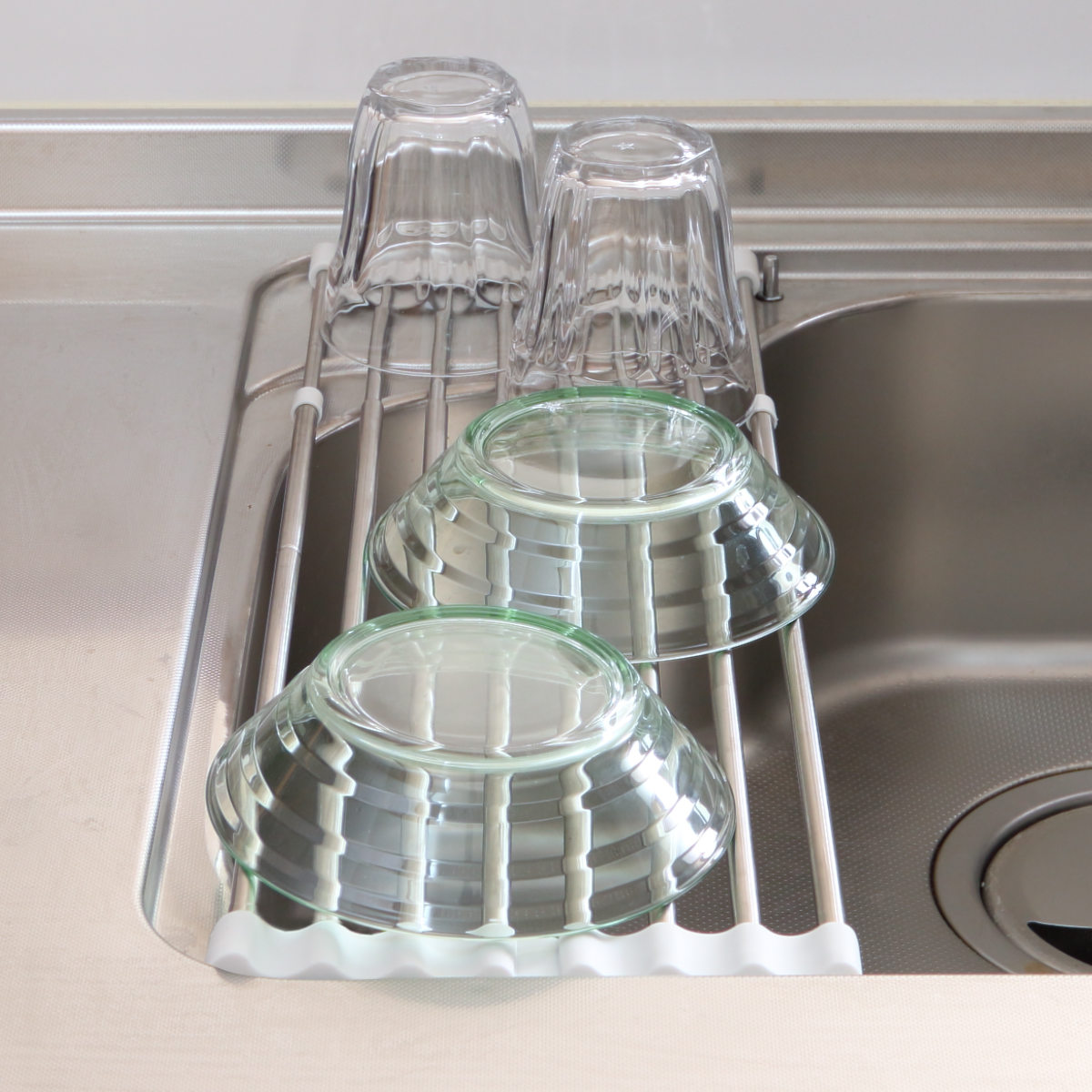必要な時にシンク上に広げるだけでスペースを有効活用できるスライドラックです。限られているキッチンのスペースを最大限活用でき、台所仕事がより快適になります。