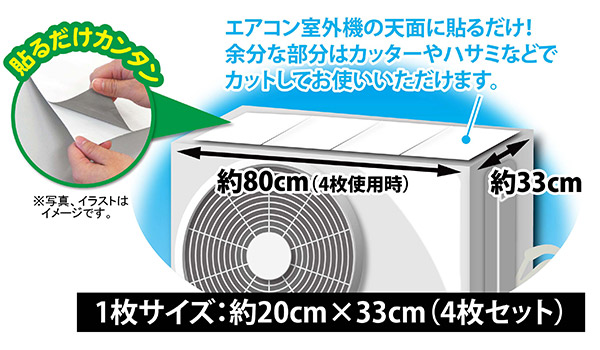 エアコンの室外機の上部に貼り、直射日光を反射する遮熱シールです。特殊反射粒子を含む遮熱塗料を使用しており、効率的に太陽光を反射します。