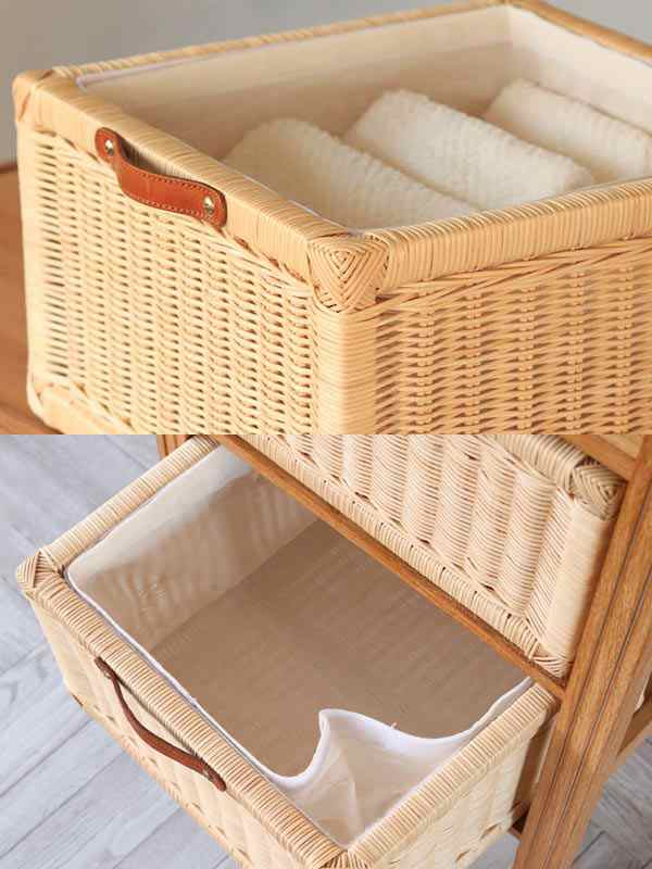 引出はラタン製バスケットのため、通気性が良く衛生的です。内布付きなので中身が傷つきにくく、衣類もひっかかりなく収納できます。手で編まれた温かみがそのまま伝わってくる、やさしいバスケットです。