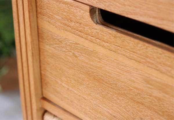 圧迫感がなく、お部屋に馴染みやすいナチュラルカラー。それでいて、チーク無垢木の素材の重厚感が感じられるデザインです。 すっきりとした見た目ながらも、無垢材ならではの気品が漂います。ランドリーやリビングチェストとして、幅広い用途でお使いいただけます。