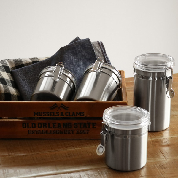 耐久性に優れた18-8ステンレス製で、におい移りしにくいため、ピクルスやハーブ、スパイスなど香りの強いものの保存も安心です。スリムタイプで持ちやすく、金具部分も開け閉めしやすいシンプルな構造で、使い勝手のいいキャニスターです。
