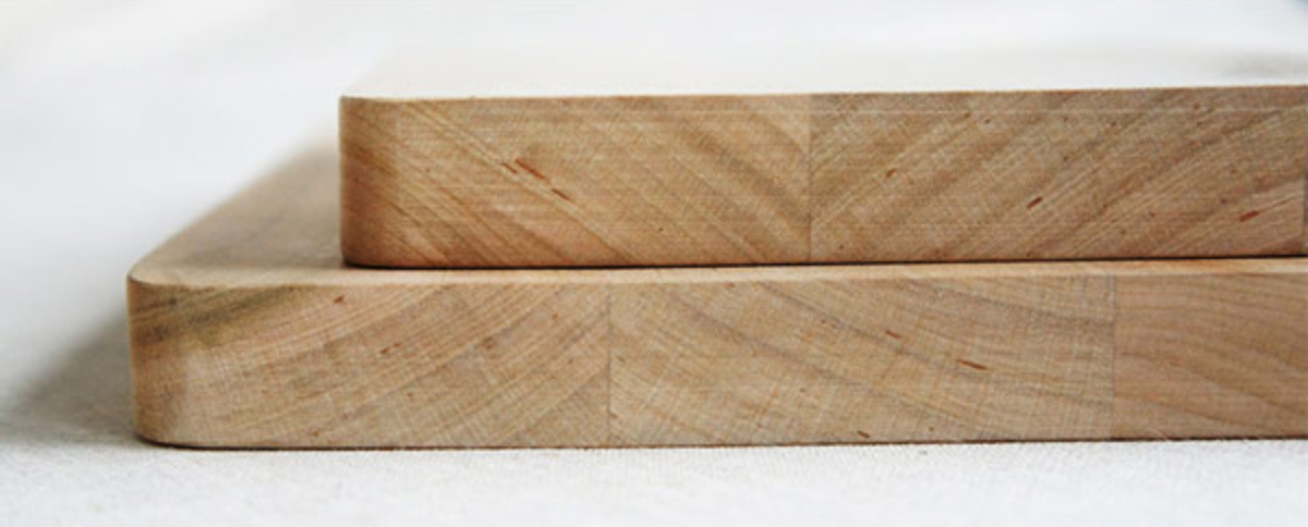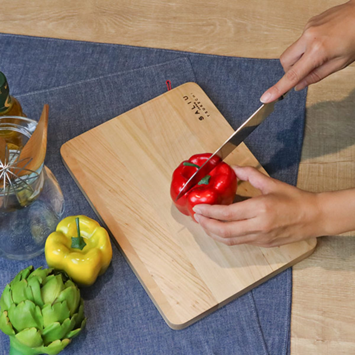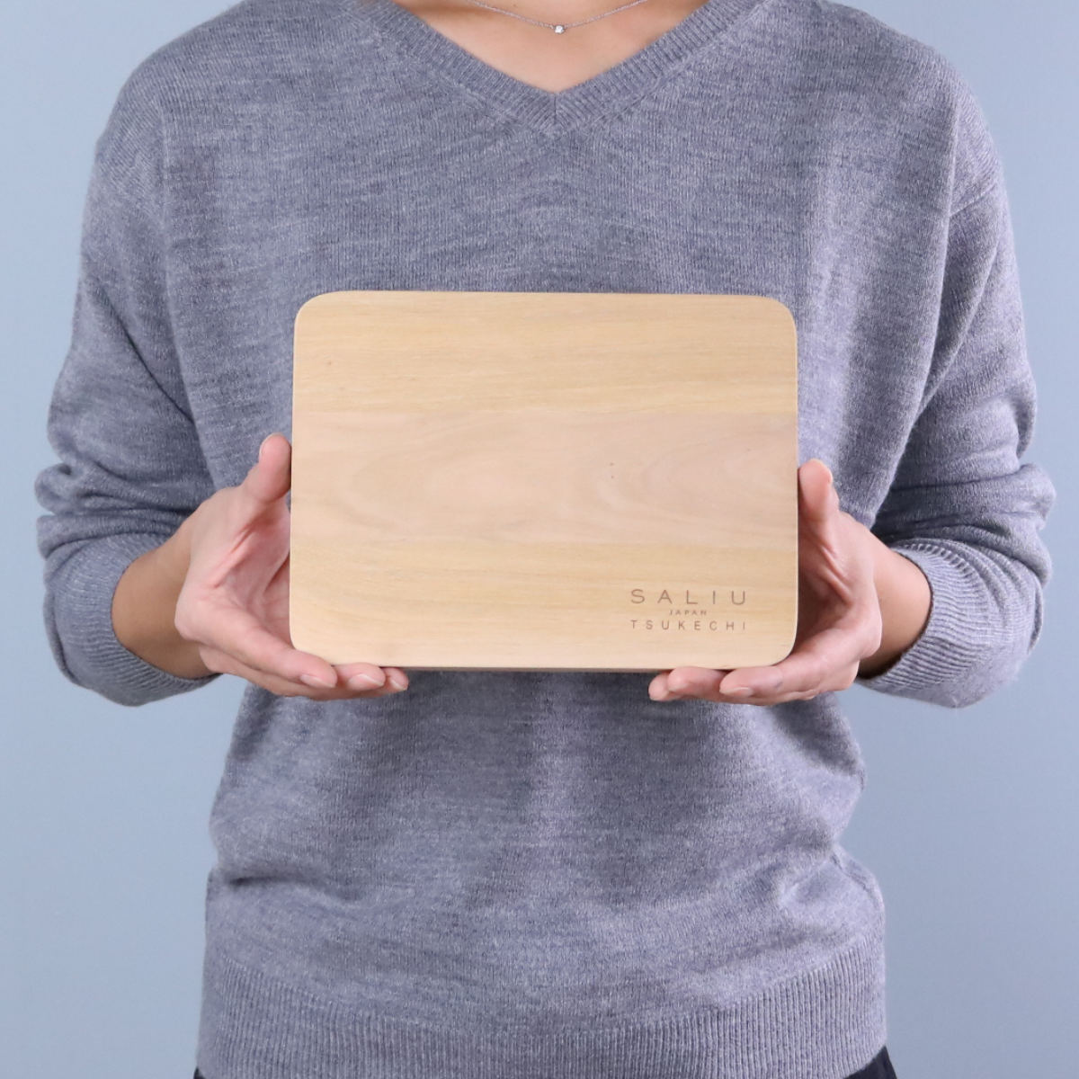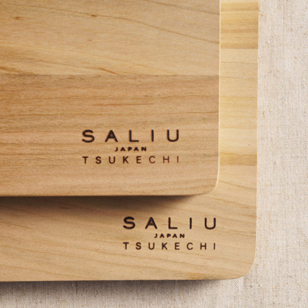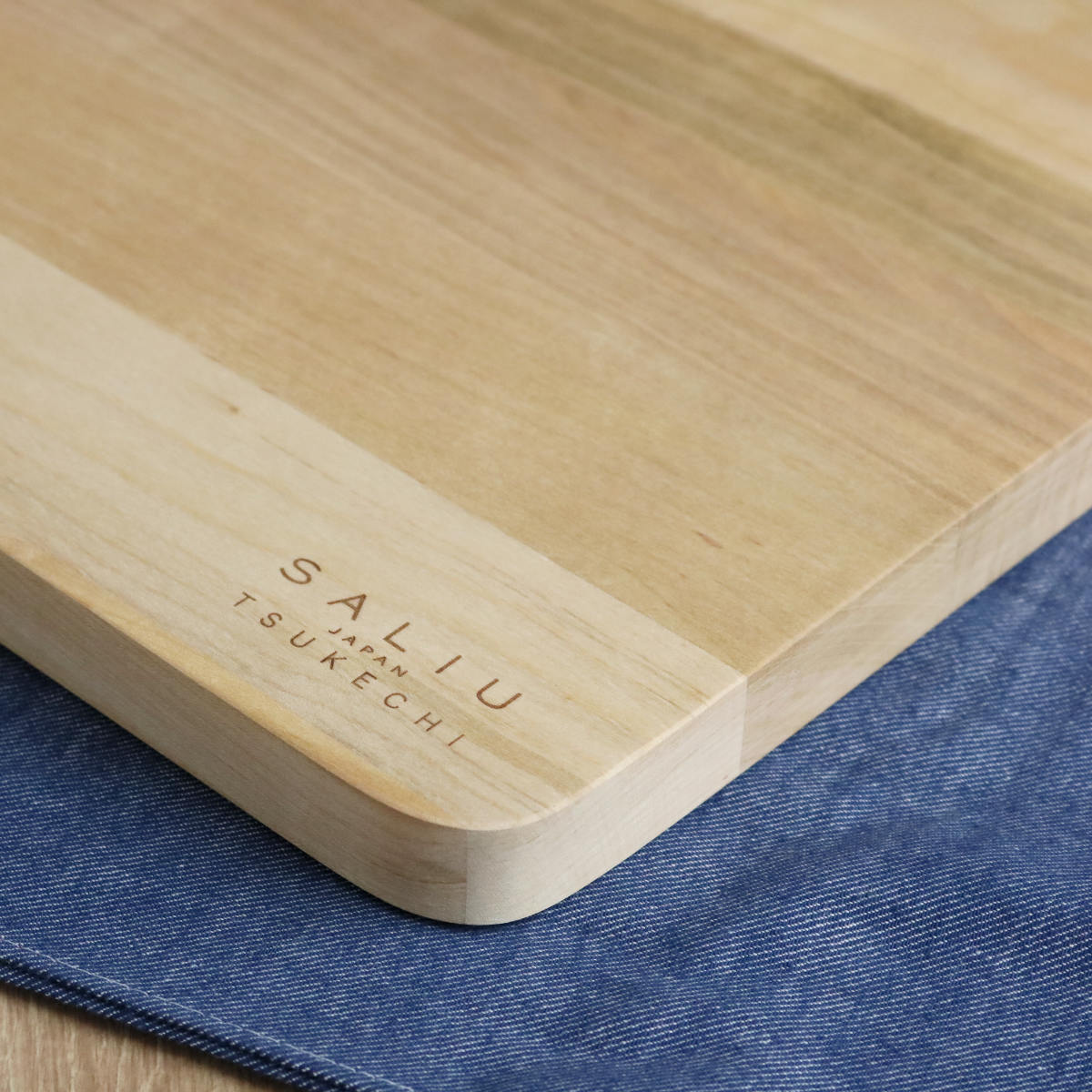 SALIUの山桜のまな板はヤニが出ず、木肌が美しいのが特徴です。硬くしっかりしているため、傷がつきにくく、木のまな板ならではのトントンと軽やかな音がキッチンに広がります。目を互い違いに組んで張り合わせることで、ソリやゆがみが少ないです。また、耐水性がありシミがつきにくいので、永くお使いいただけます。