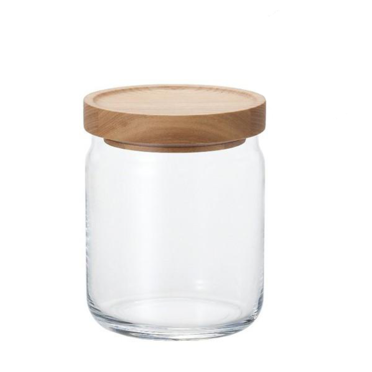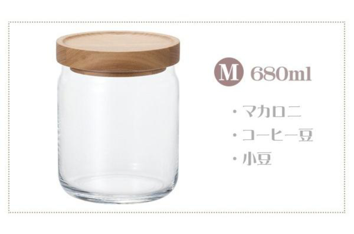 サイズ違いで揃えても、それぞれ同じ径なので積み重ねて収納できます。並べた時に無駄なスペースができず、収納スペースを有効に活用できる木蓋ガラス容器です。