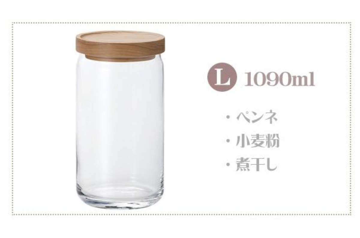 ペンネや小麦粉、煮干しなどストック品の保存に便利なLサイズです。