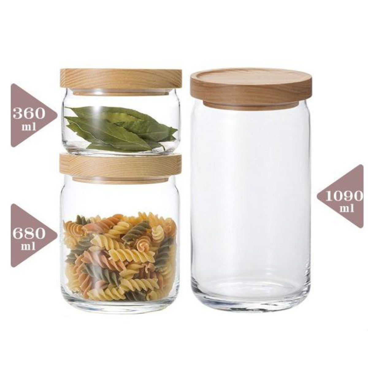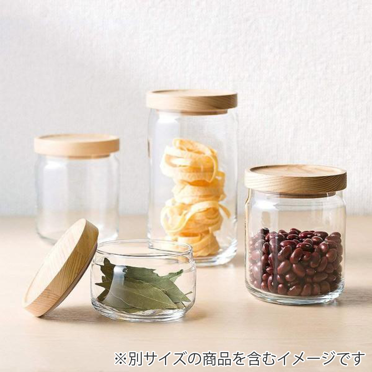 サイズ違いで揃えても、それぞれ同じ径なので積み重ねて収納できます。並べた時に無駄なスペースができず、収納スペースを有効に活用できる木蓋ガラス容器です。