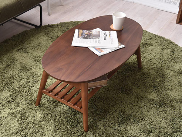 ローテーブル センターテーブル 木製 ウォールナット調 幅88cm ( テーブル リビングテーブル 机 収納棚付き コーヒーテーブル カフェテーブル つくえ てーぶる 折りたたみ リビング ) 【 オーバル 】