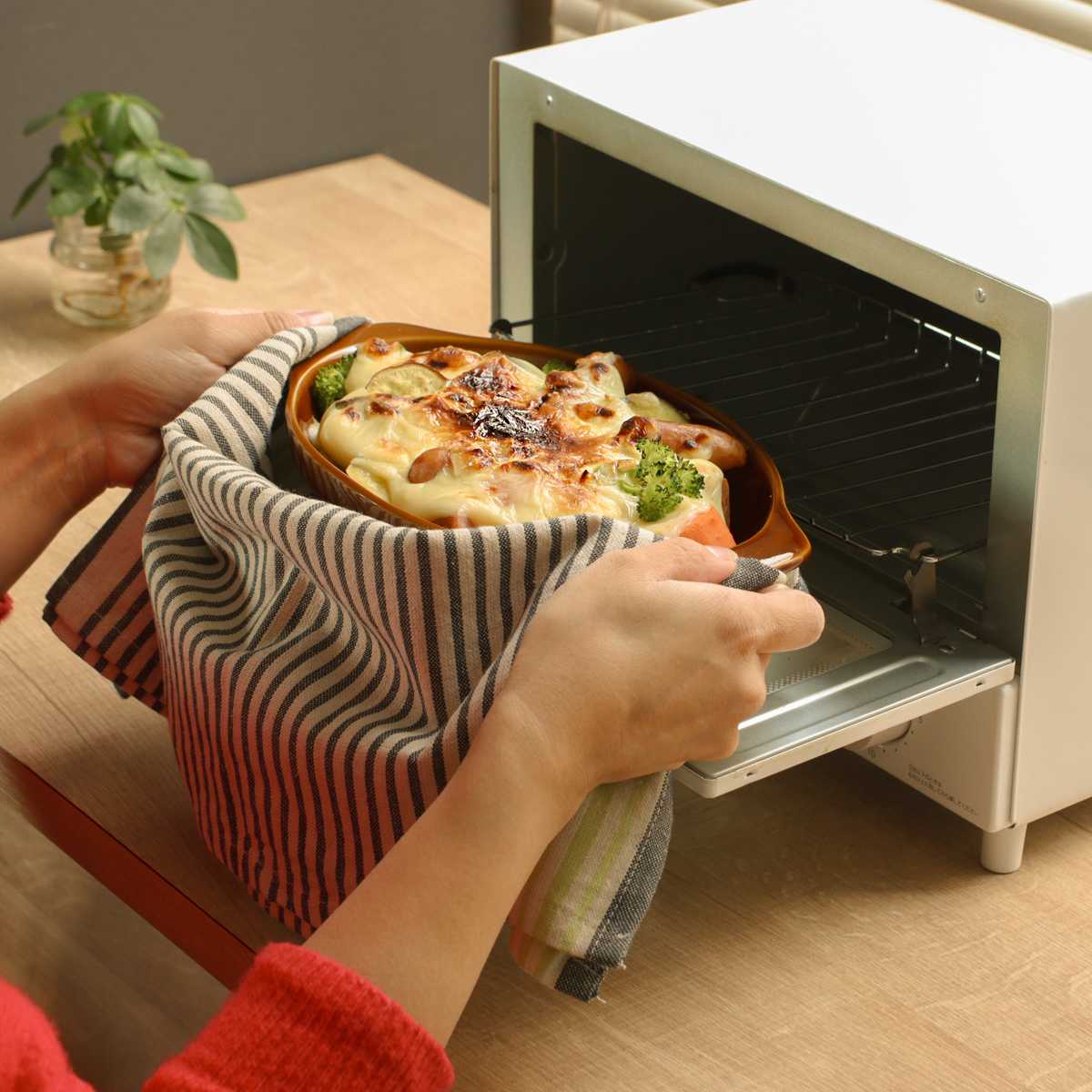 両サイドの耳はミトンをしても掴みやすく、オーブンの出し入れや食卓に運ぶ時もスムーズです。