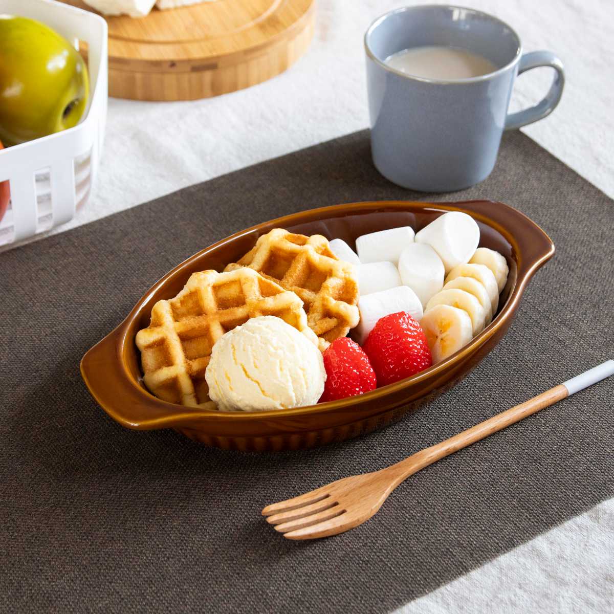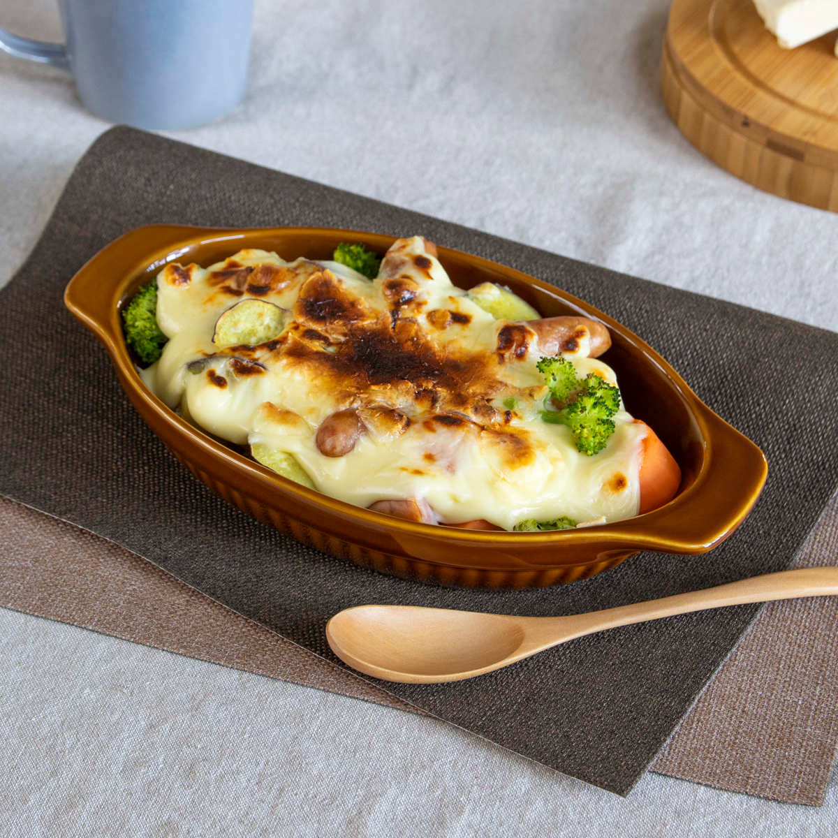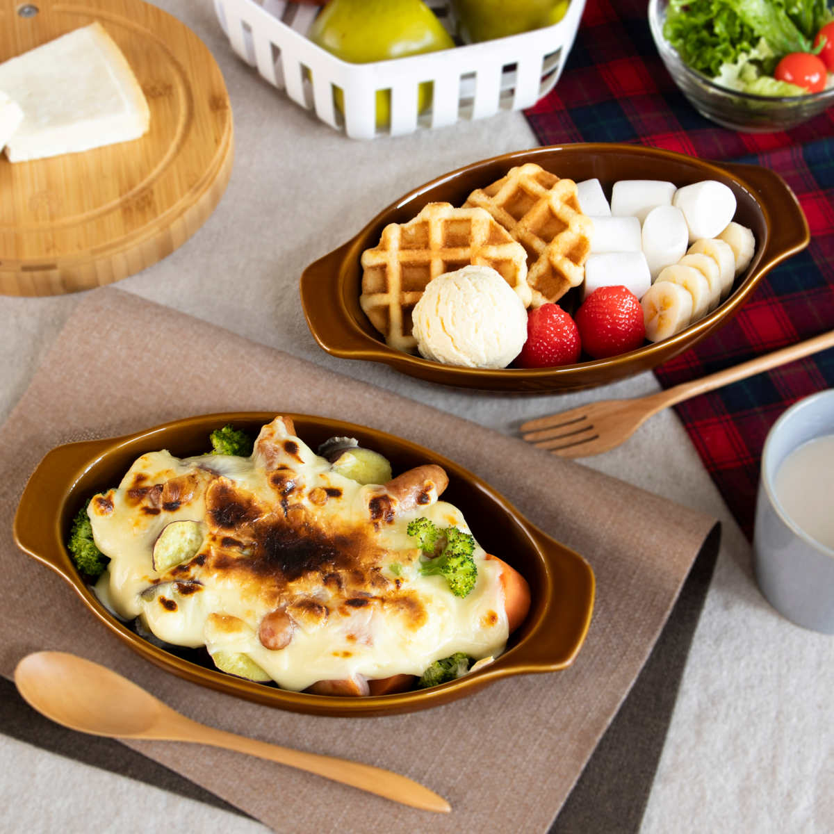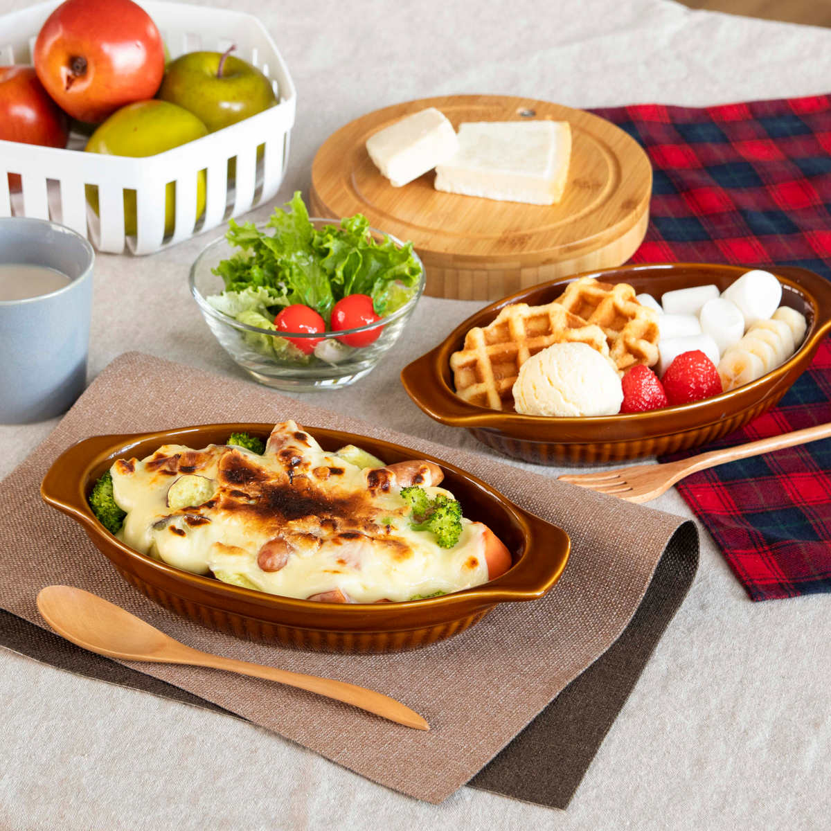 フレンチトーストやブラウニーなどのお菓子作りにも便利です。忙しい朝も、チーズや残り物のおかずを入れてオーブンで加熱すれば時短になり、朝食にもおすすめです。シチューや煮込みハンバーグの器としても使えます。