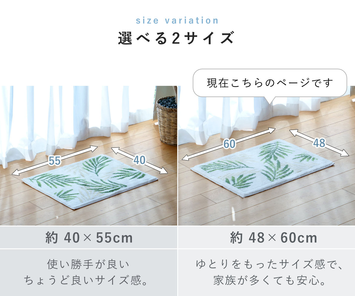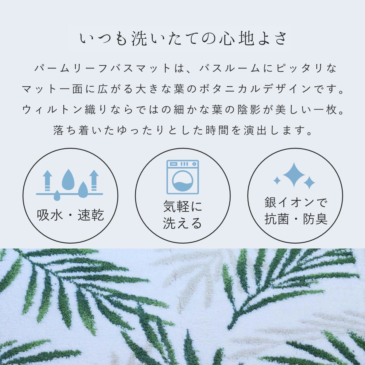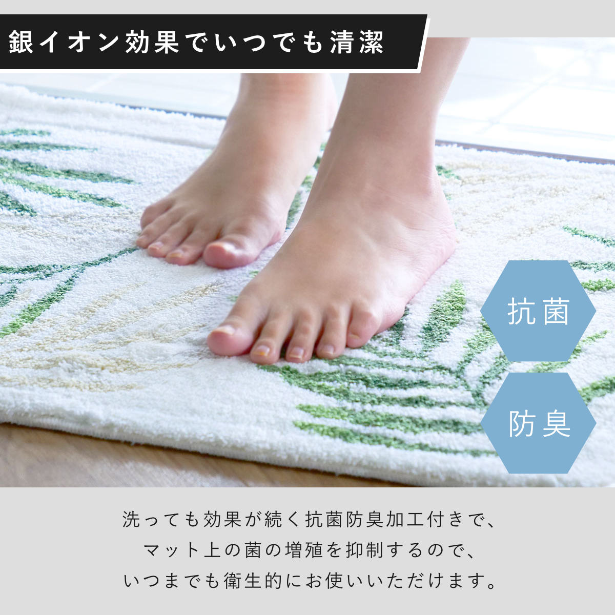 洗っても効果が続く抗菌防臭加工付きで、マット上の菌の増殖を抑制するので、いつまでも衛生的にお使いいただけます。