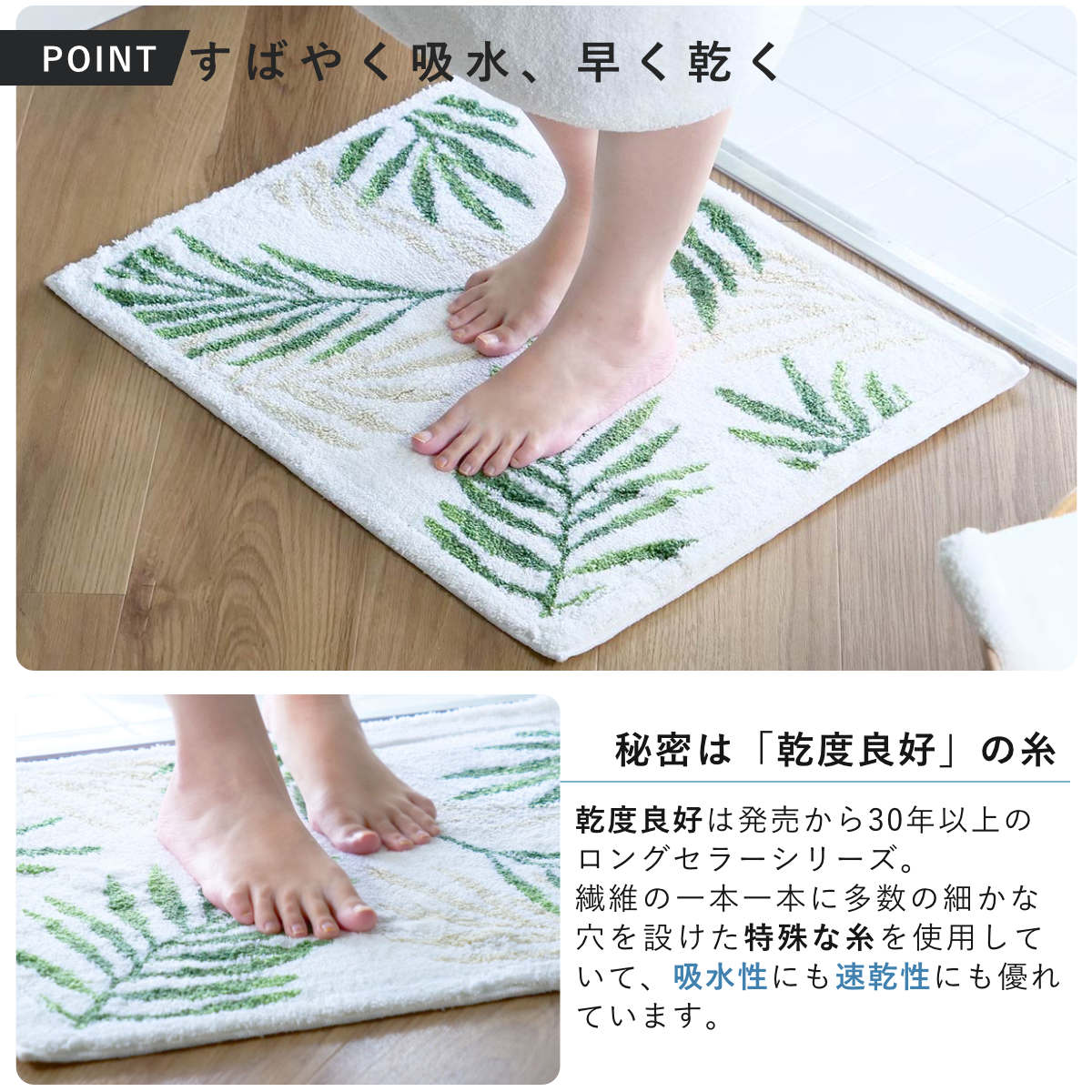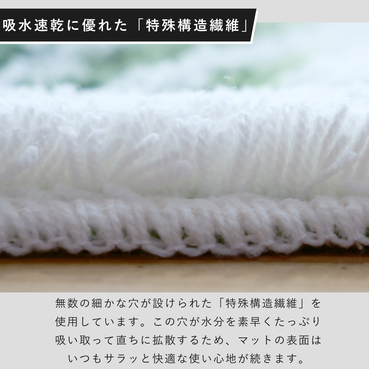 無数の細かな穴が設けられた「特殊構造繊維」を使用しています。この穴が水分を素早くたっぷり吸い取って直ちに拡散するため、マットの表面はいつもサラッと快適な使い心地が続きます。