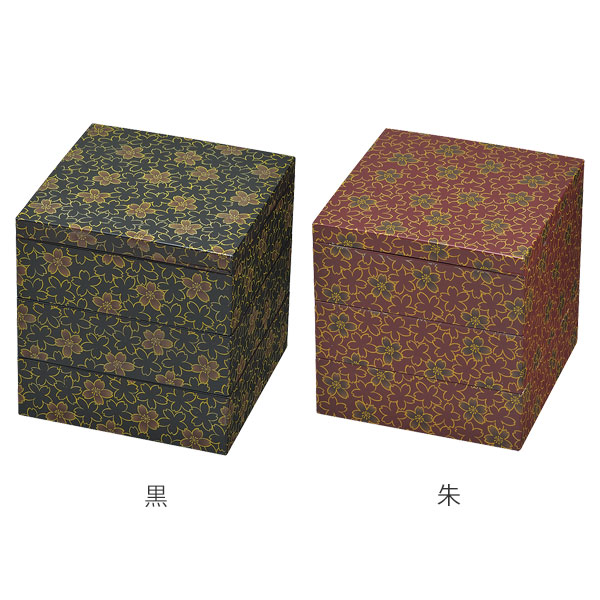 日本の花とも言われる桜柄を全面にデザインした伝統美が光る三段重箱です。 お正月のおせち料理はもちろん、お花見や行楽、運動会などにもおすすめで、さまざまなシーンで活躍します。お色は黒と朱の2色からお選びいただけます。