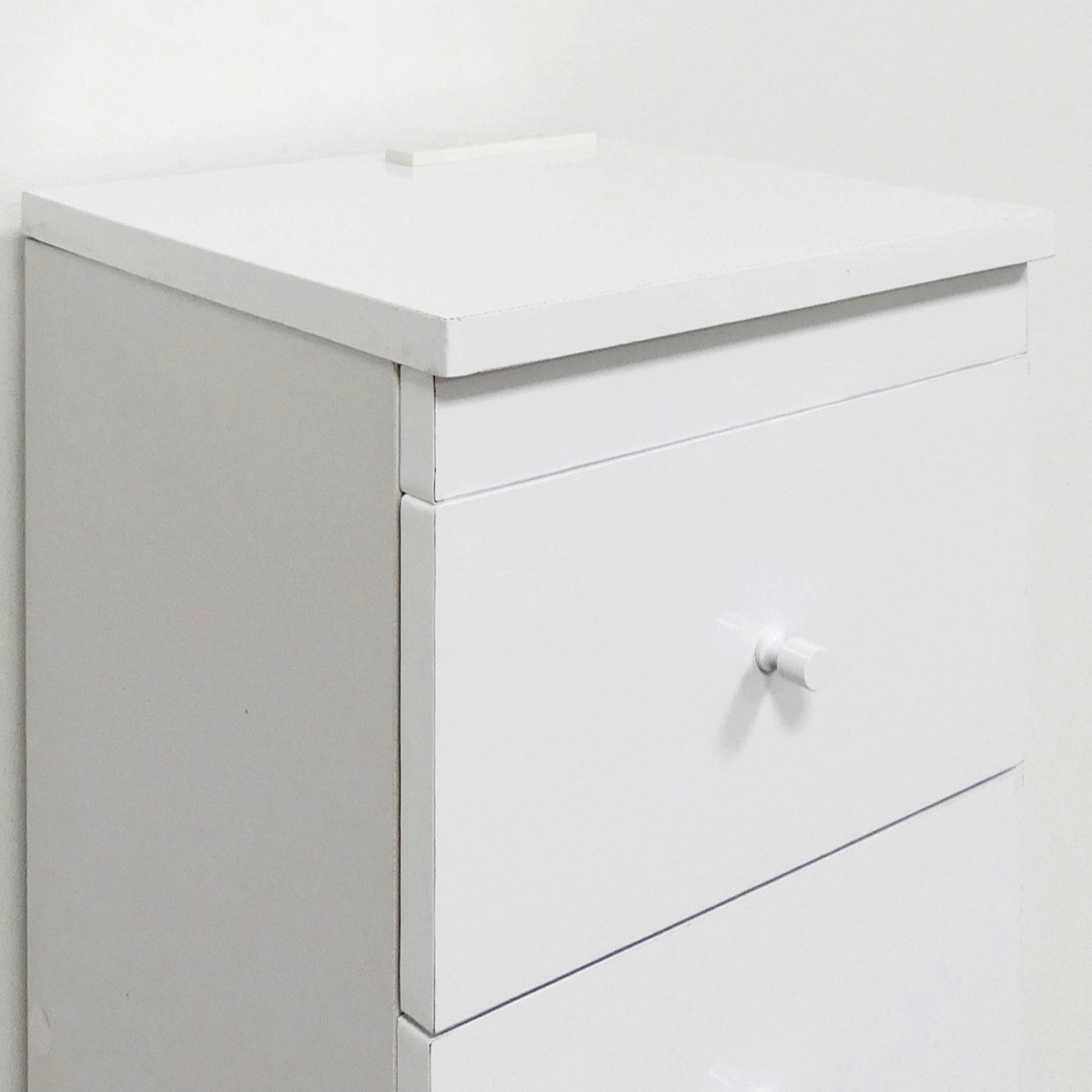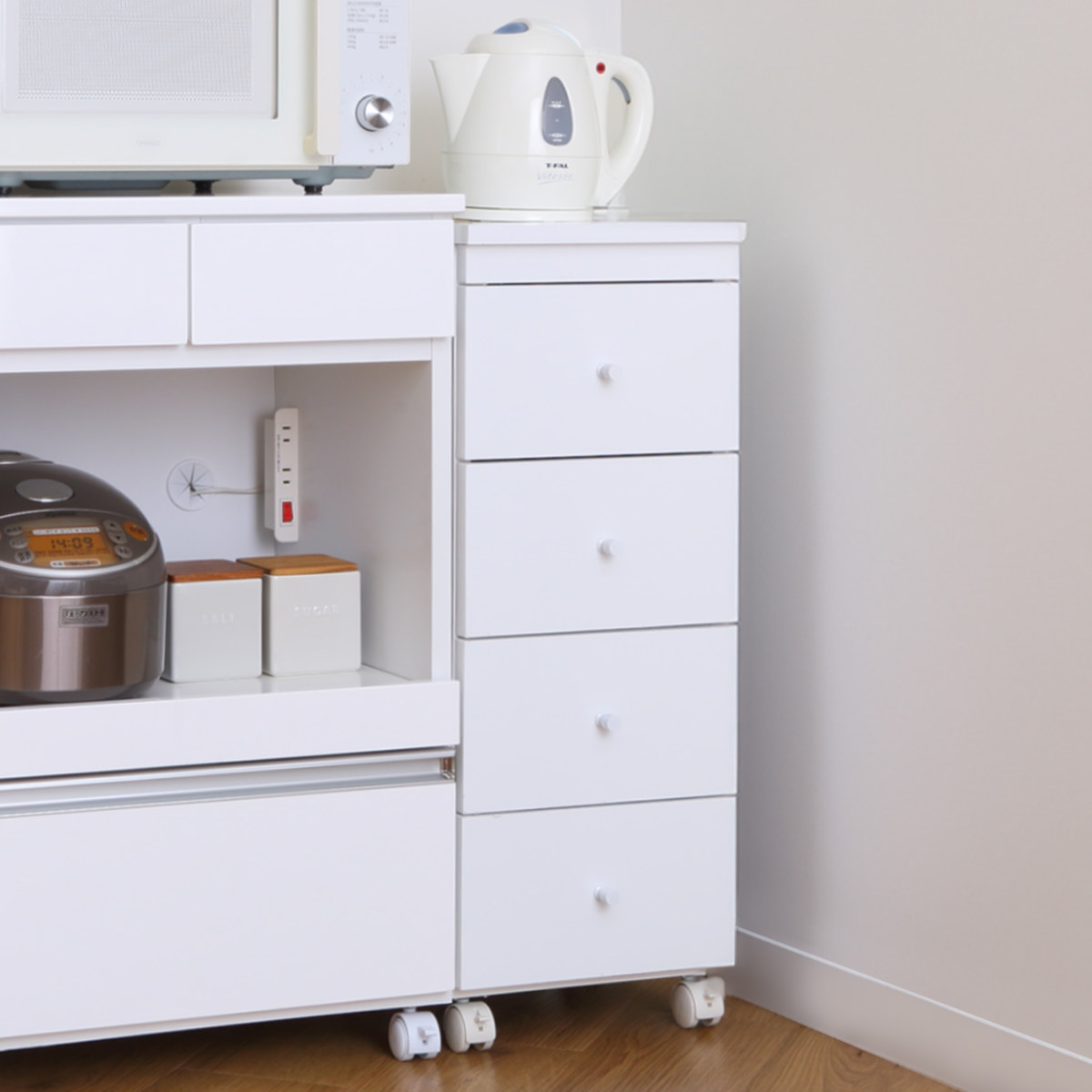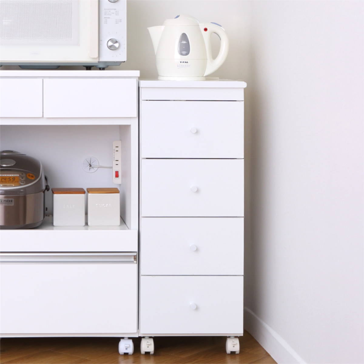 清潔感のあるホワイトカラーがお部屋をパッと明るく見せる、スリムチェストです。キッチンや洗面所のちょっとした隙間に収まる幅30cmで、限られた空間を有効に活用することができます。キャスターと取っ手を取り付けるだけの完成品でのお届けなので、すぐにお使いいただけます。