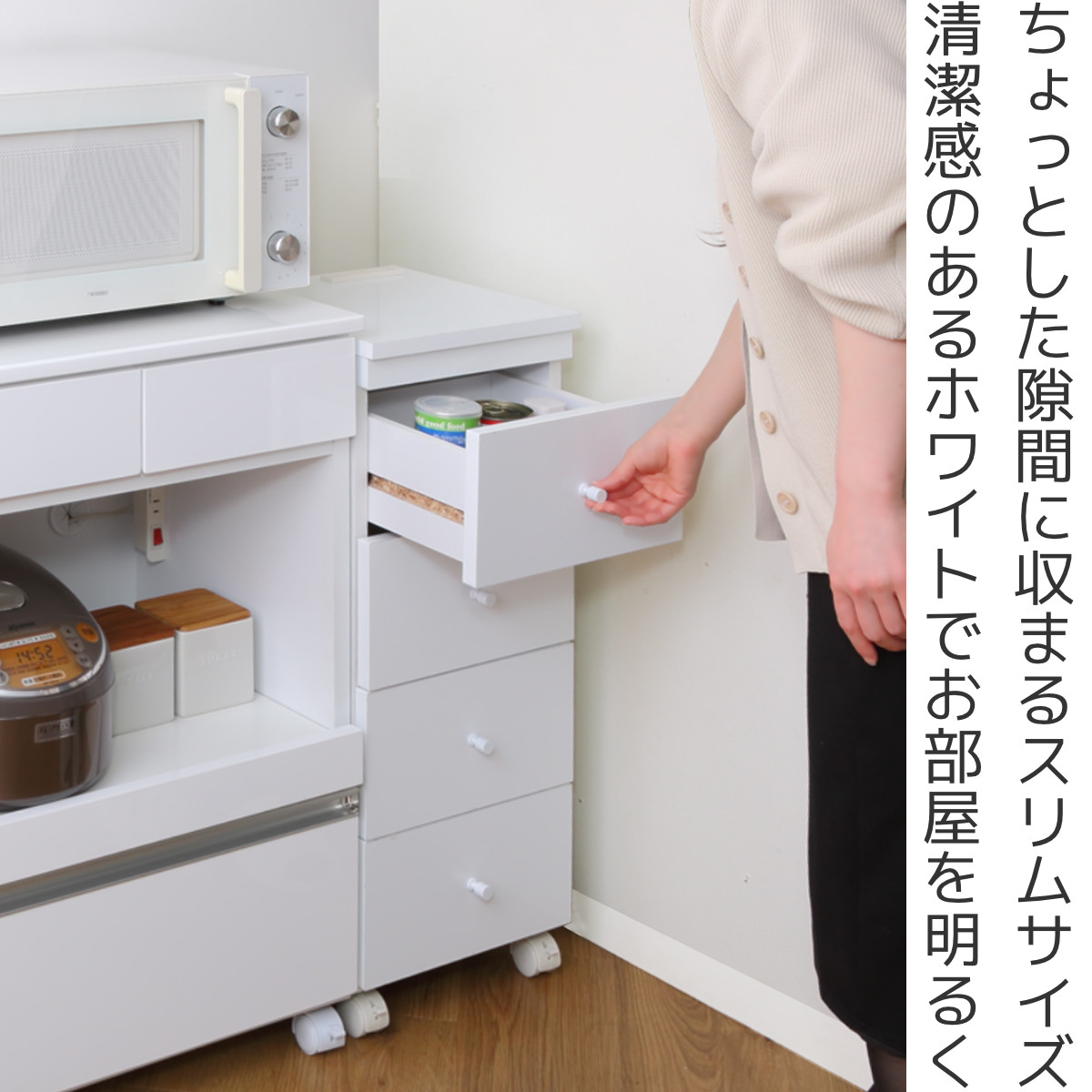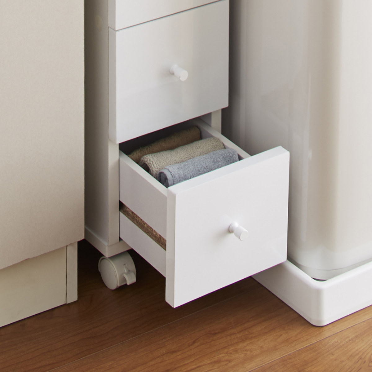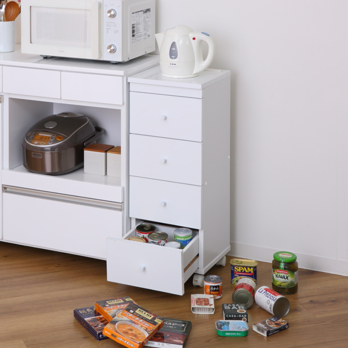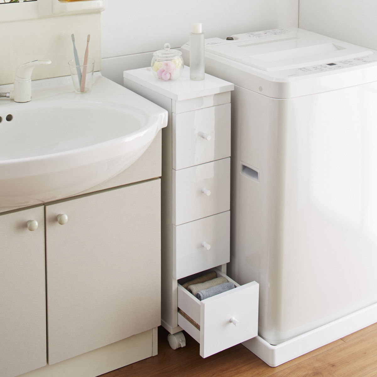 清潔感のあるホワイトカラーがお部屋をパッと明るく見せる、スリムチェストです。キッチンや洗面所のちょっとした隙間に収まる幅30cmで、限られた空間を有効に活用することができます。キャスターと取っ手を取り付けるだけの完成品でのお届けなので、すぐにお使いいただけます。
