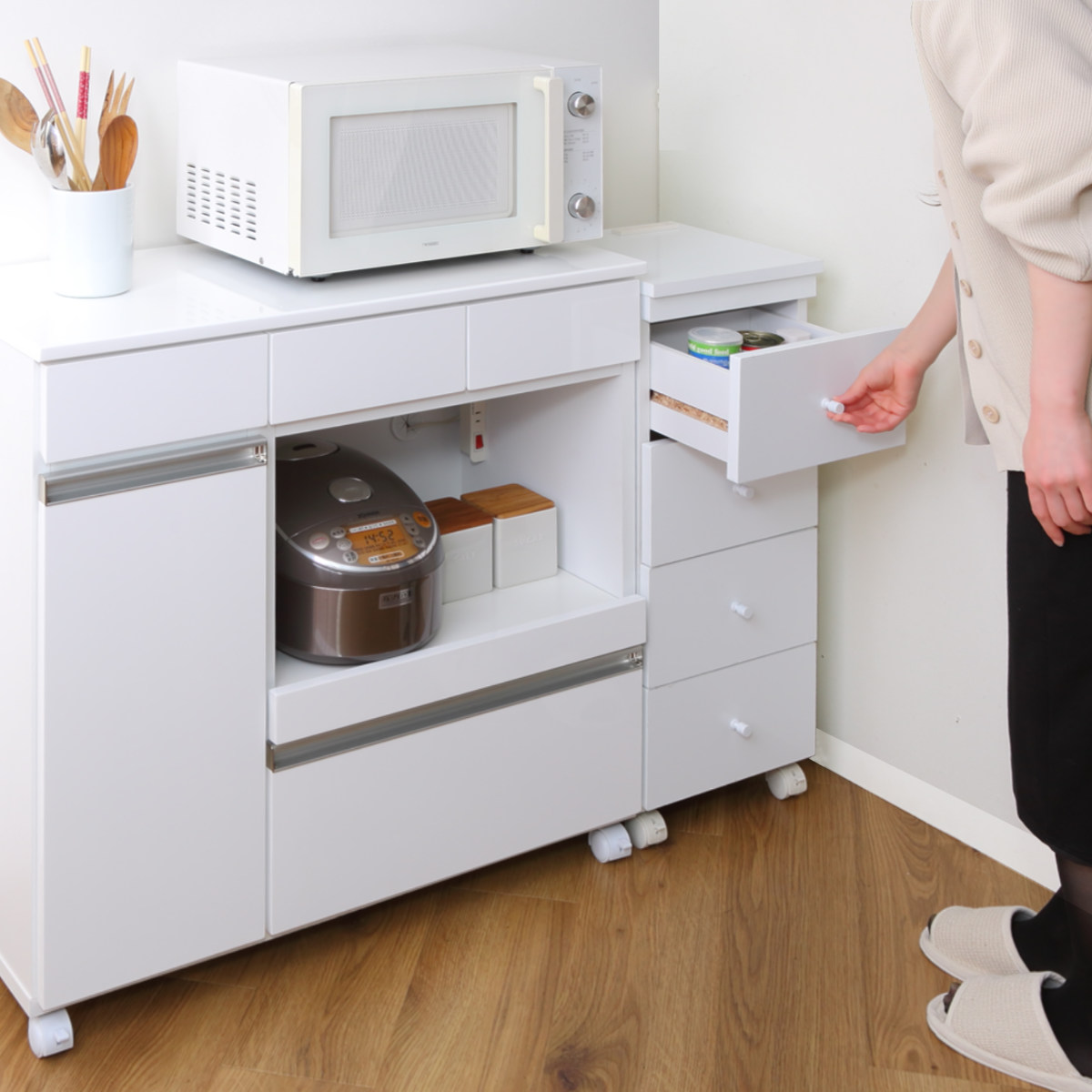 程よい深さの引出しが4杯。食品や洗面用品のストック、タオルなどの小物を整理できます。