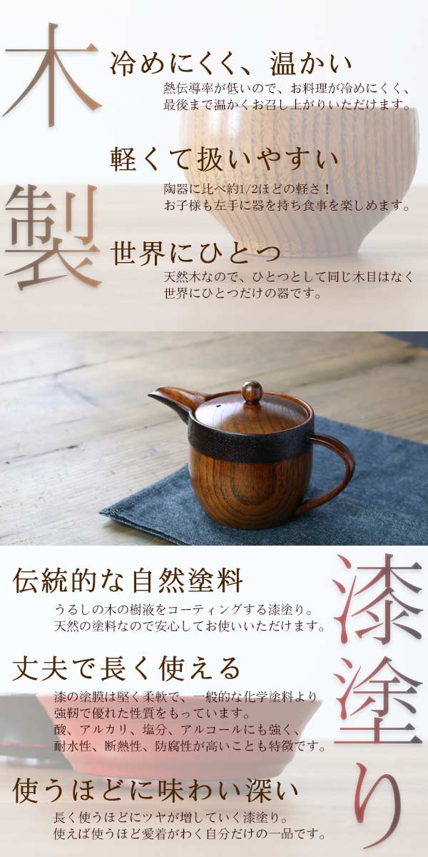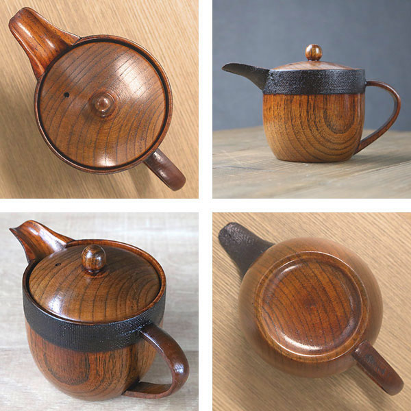 ぬくもりを感じさせる木の急須は長く使うほどに手に馴染み、愛着が増してきます。漆塗りが施され、つややかな仕上がりで味わい深い急須です。天然木ならではの、年輪の木目・木地の色味・ふしなどそれぞれの個性をお楽しみ下さい。
