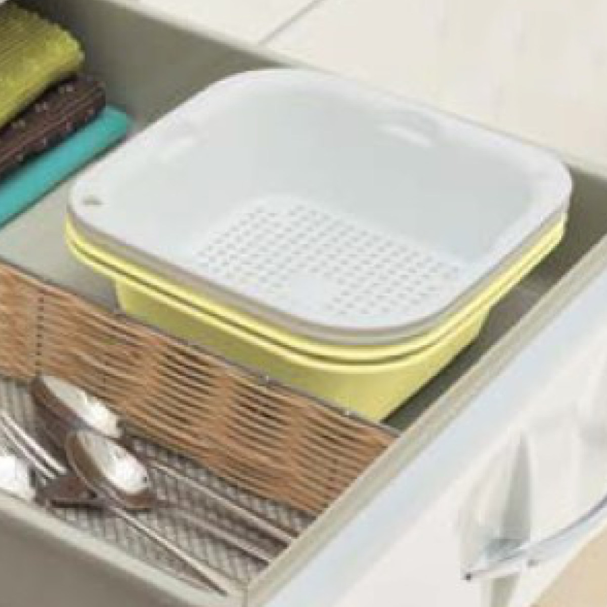 ザルとバットは重ねてスッキリ収納できるため、引き出し内でも場所をとりません。持ち運びもしやすく、使いたい時にサッと取り出せます。