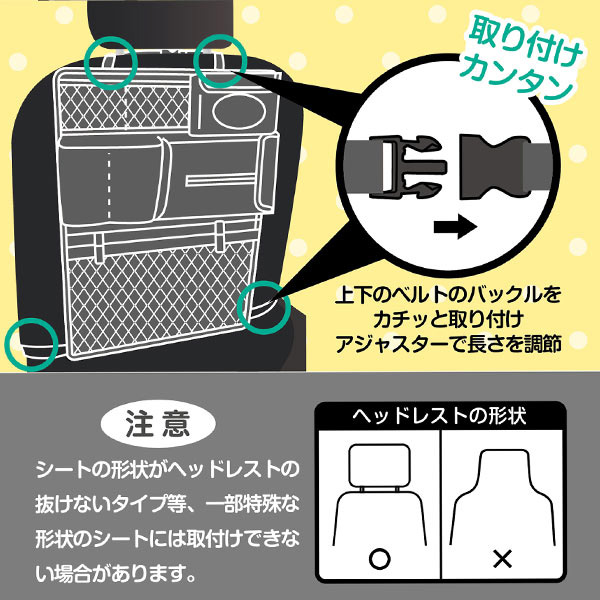 こまごました小物を収納できるポケットがたくさんついたシートバックポケットです。使い方は簡単!車のヘッドレストにつけるだけ。必要なときにサッと取り出せて、とても便利です。