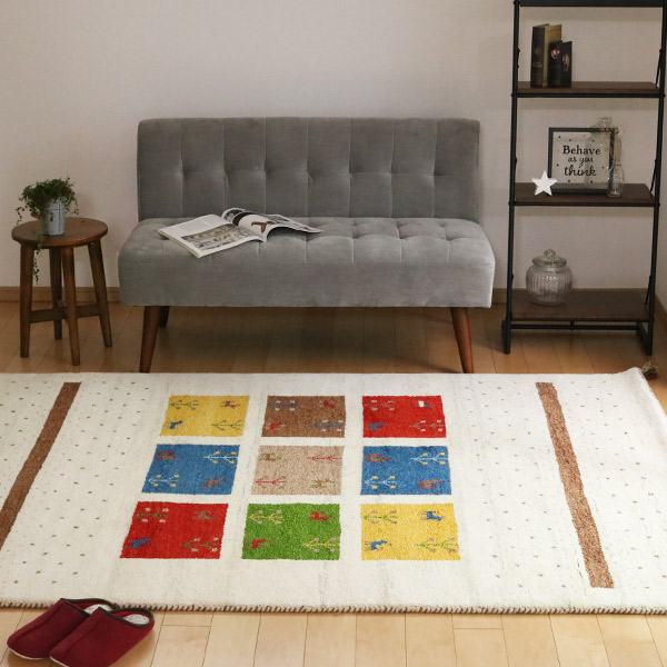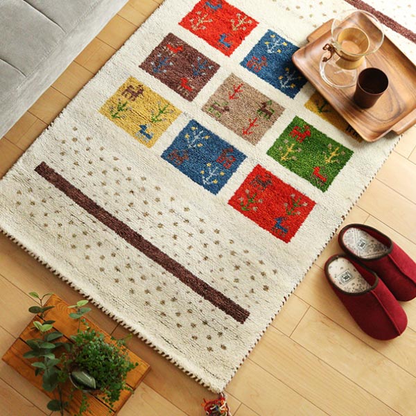 ギャッベにはウールが使用されており、「冬暖かく夏涼しい」「湿気を吸収・放湿」「弾力性が高くへたりにくい」「燃えにくい」「染めやすく色落ちしにくい」「汚れにくい」といった特徴があります。使うほどに風合いが増し、編み目が細かいためゴミも入りにくく、普段のお手入れは掃除機をかけるだけで十分です。デザインだけでなく機能性も優れ、一生モノのマットとして永く愛用できます。