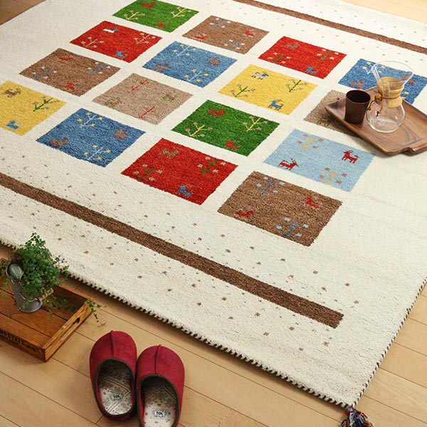 ギャッベにはウールが使用されており、「冬暖かく夏涼しい」「湿気を吸収・放湿」「弾力性が高くへたりにくい」「燃えにくい」「染めやすく色落ちしにくい」「汚れにくい」といった特徴があります。使うほどに風合いが増し、編み目が細かいためゴミも入りにくく、普段のお手入れは掃除機をかけるだけで十分です。デザインだけでなく機能性も優れ、一生モノのマットとして永く愛用できます。