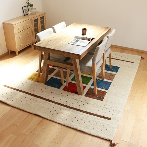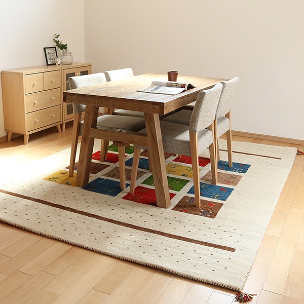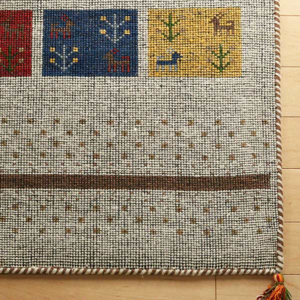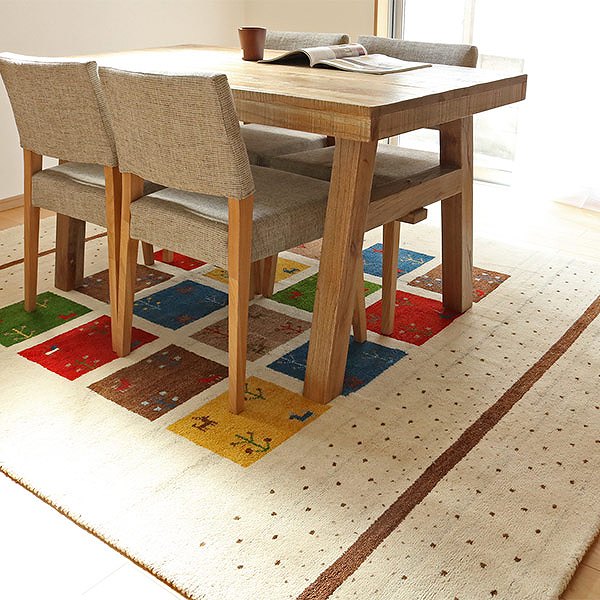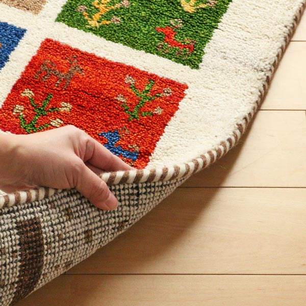 ギャッベにはウールが使用されており、「冬暖かく夏涼しい」「湿気を吸収・放湿」「弾力性が高くへたりにくい」「燃えにくい」「染めやすく色落ちしにくい」「汚れにくい」といった特徴があります。使うほどに風合いが増し、編み目が細かいためゴミも入りにくく、普段のお手入れは掃除機をかけるだけで十分です。デザインだけでなく機能性も優れ、一生モノのマットとして永く愛用できます。