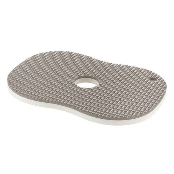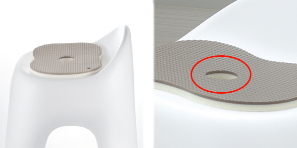 | 背もたれ付きでも使える 背もたれ付きのバスチェアにもピッタリと置くことができます。 | 排水穴付き 中央に穴が開いているので、しっかり排水できます。 |