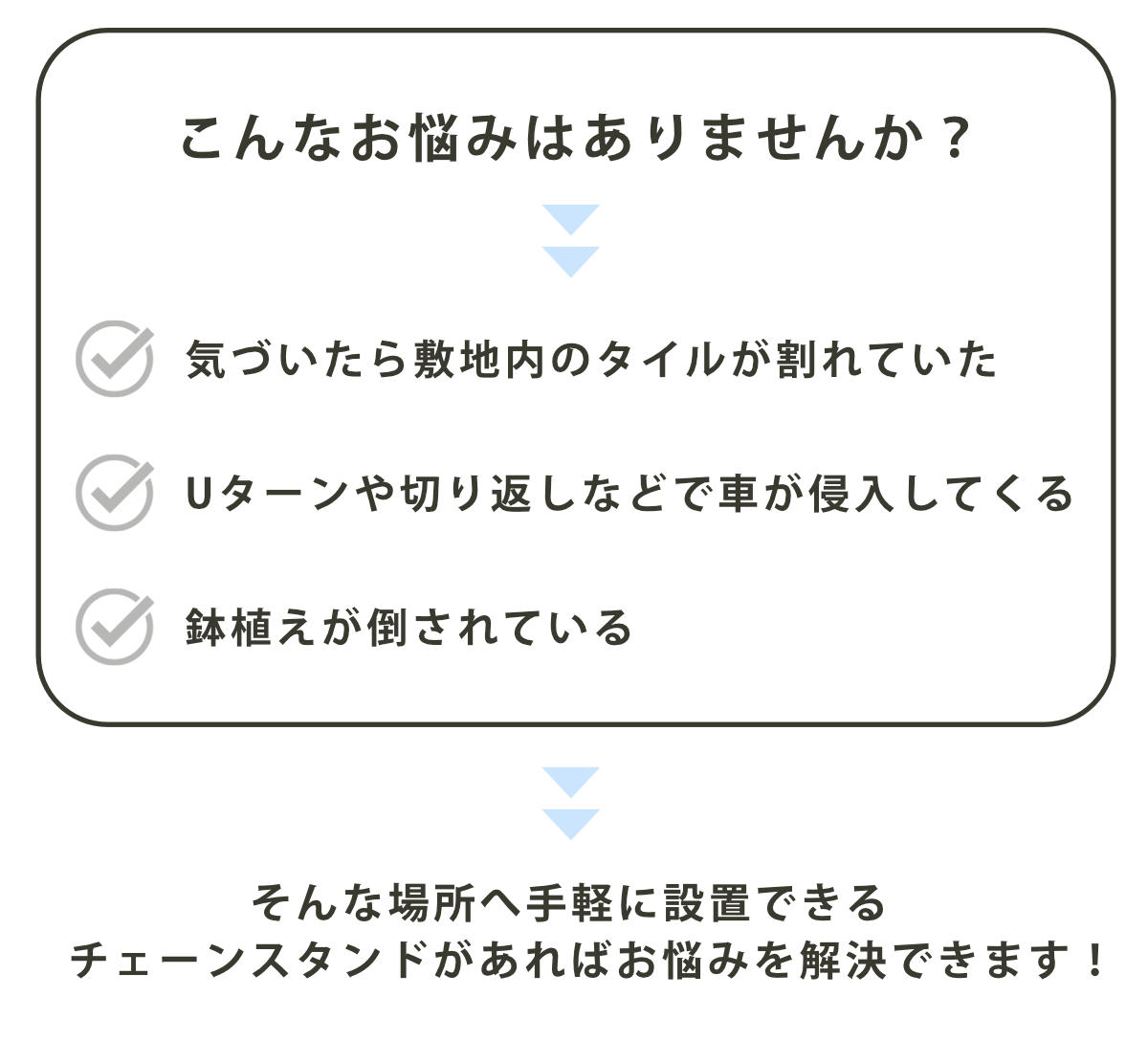 玄関の階段や建物の出入口周辺など、段差のある場所でもチェーンをつけて設置できます。チェーンは別売りのため、設置環境に合わせて長さやデザインを自由に調整可能です。
